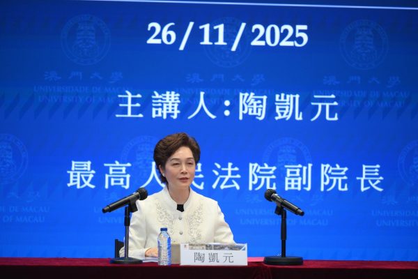 The University of Macau (UM) held a talk titled ‘Judicial Protection of Intellectual Property in China: Opportunities, Challenges, and Strategic Responses in the Era of Technological Innovation’ on 26 November as part of the University Lecture Series. Tao Kaiyuan, vice president of the Supreme People’s Court and grand justice of the second rank, discussed new developments and institutional responses in the judicial protection of intellectual property rights amid China’s rapid technological innovation. The talk attracted a large and diverse audience.