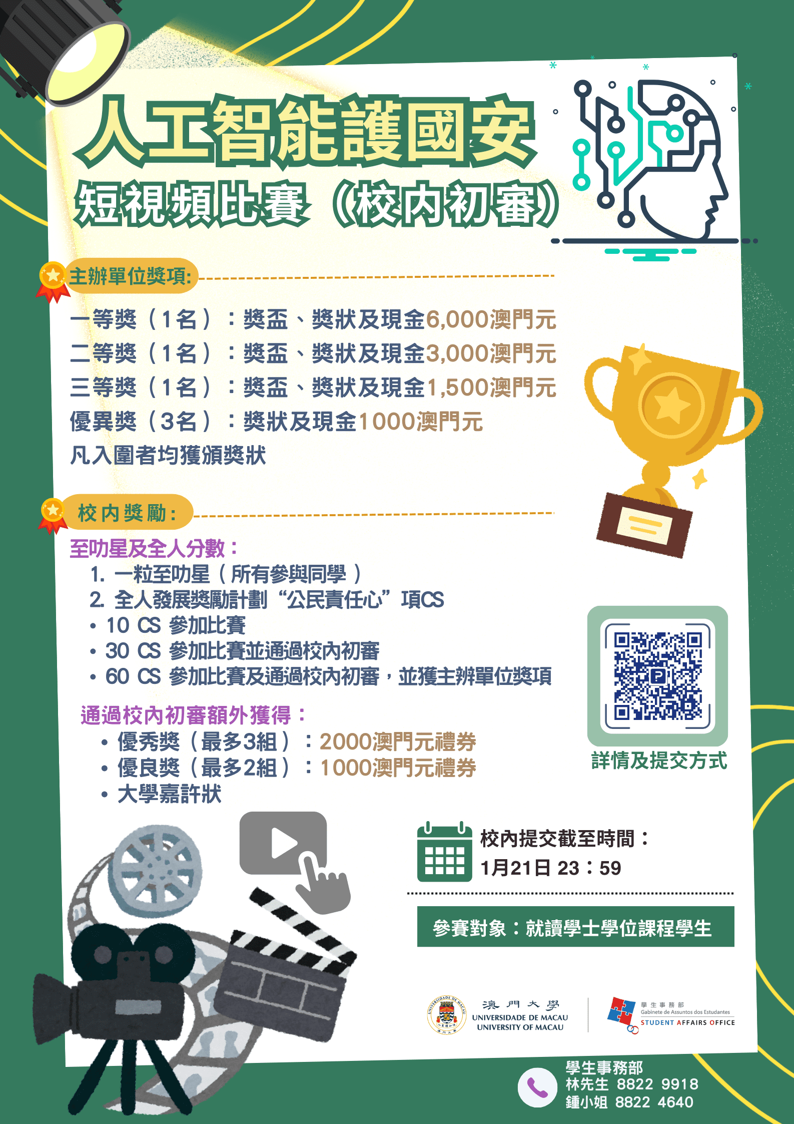 為鼓勵青少年探討人工智能技術對進一步築牢國家安全屏障的關鍵作用,引導他們把握好發展與安全的內在關係,強化澳門青少年作為國家安全守護者的擔當。澳門特別行政區政府和中央人民政府駐澳門特別行政區聯絡辦公室聯合舉辦 “人工智能護國安”短視頻比賽。