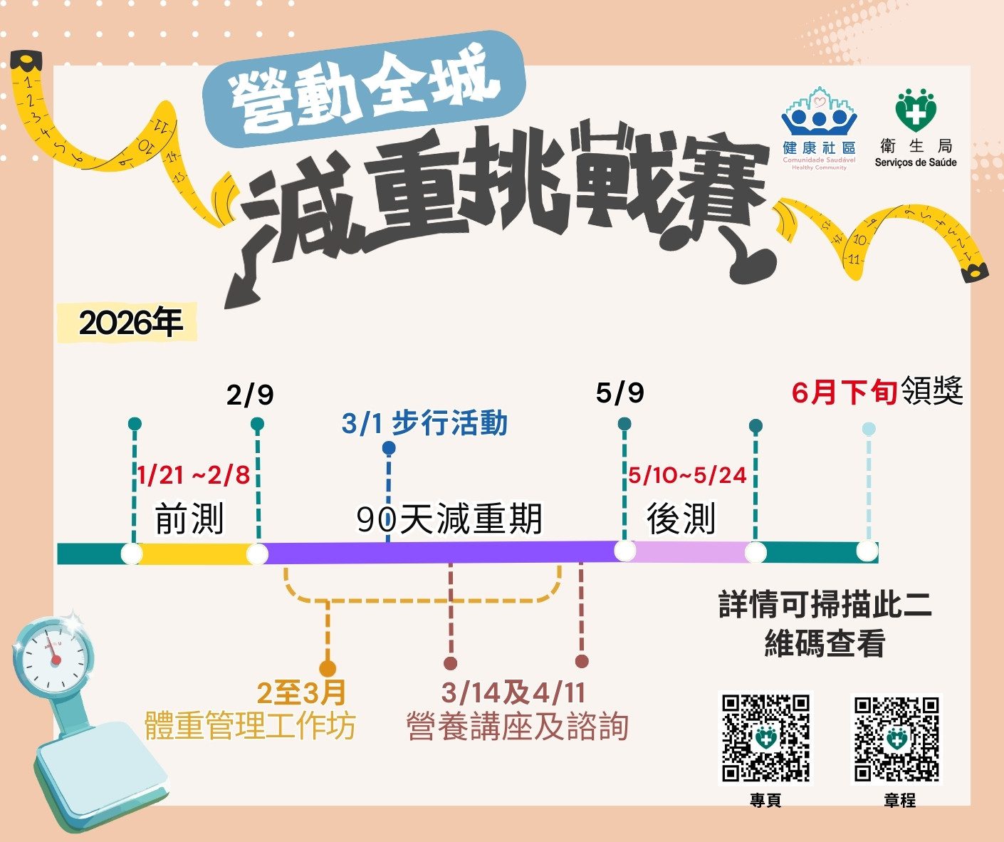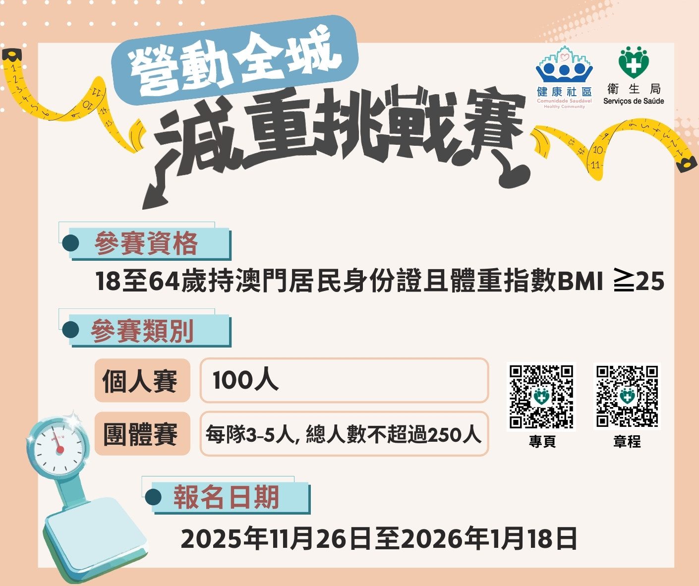 The Health Bureau is organizing the “Get Active Citywide” Weight Loss Challenge. For more information, kindly refer to the Rules & Regulations (in English and Portuguese) or visit the Weight Loss Activity website (in Portuguese).