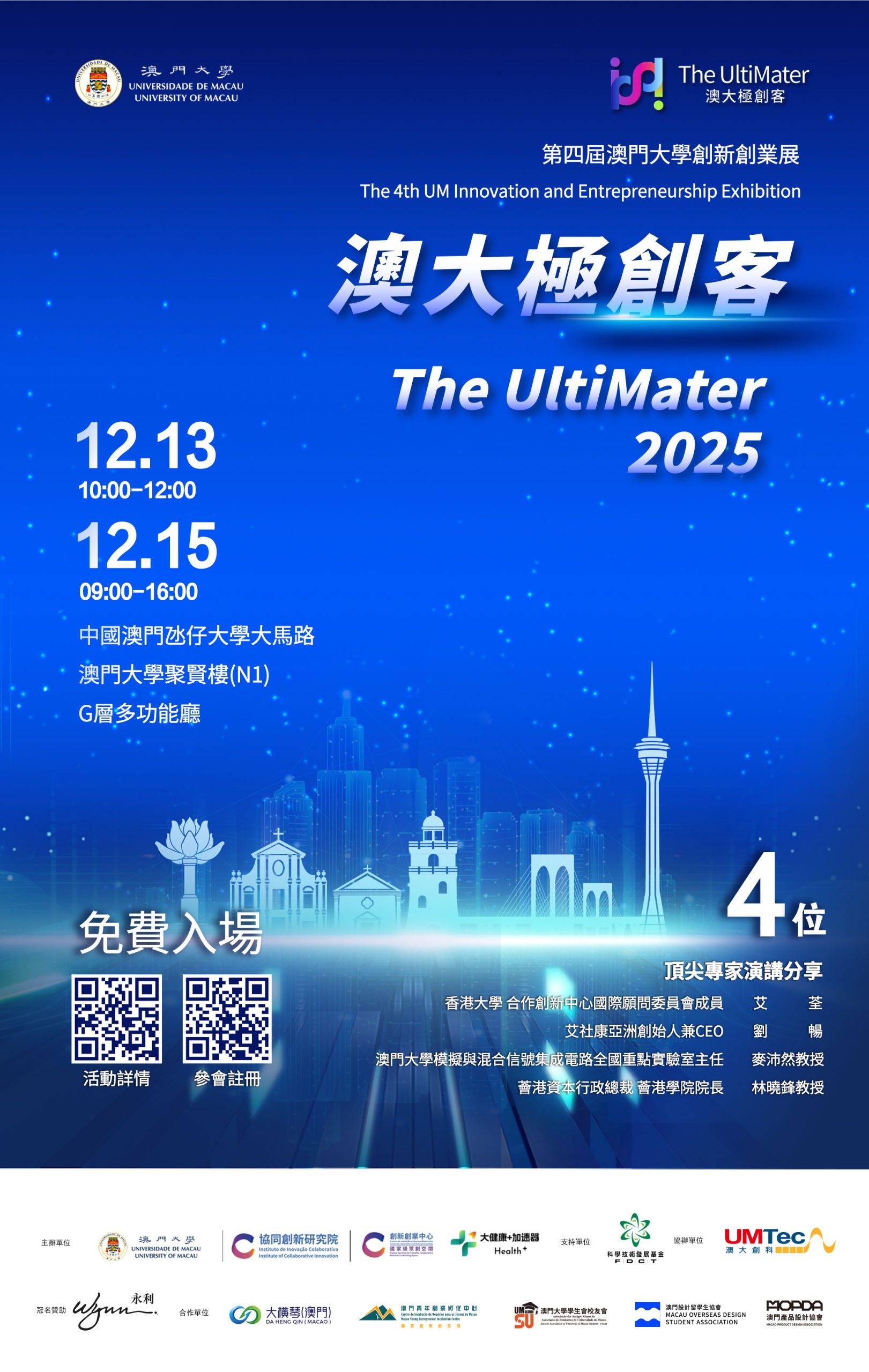 The opening ceremony of the UltiMater 2025 – The 4th UM Innovation and Entrepreneurship Exhibition will be held at 9:30am on 15 December (Monday) in the Multi-function Hall of the UM Guest House (N1-G014) and will be conducted in Mandarin. A full day of activities, including speeches, forums, and a start-up roadshow, will follow. To register for the exhibition, please visit https://umac.au1.qualtrics.com/jfe/form/SV_0AQ4nIybyWCerqK. For enquiries, please call +853 8822 9219 or +853 8822 9429, or email the UM Centre for Innovation and Entrepreneurship at ICI.Innovation@um.edu.mo.