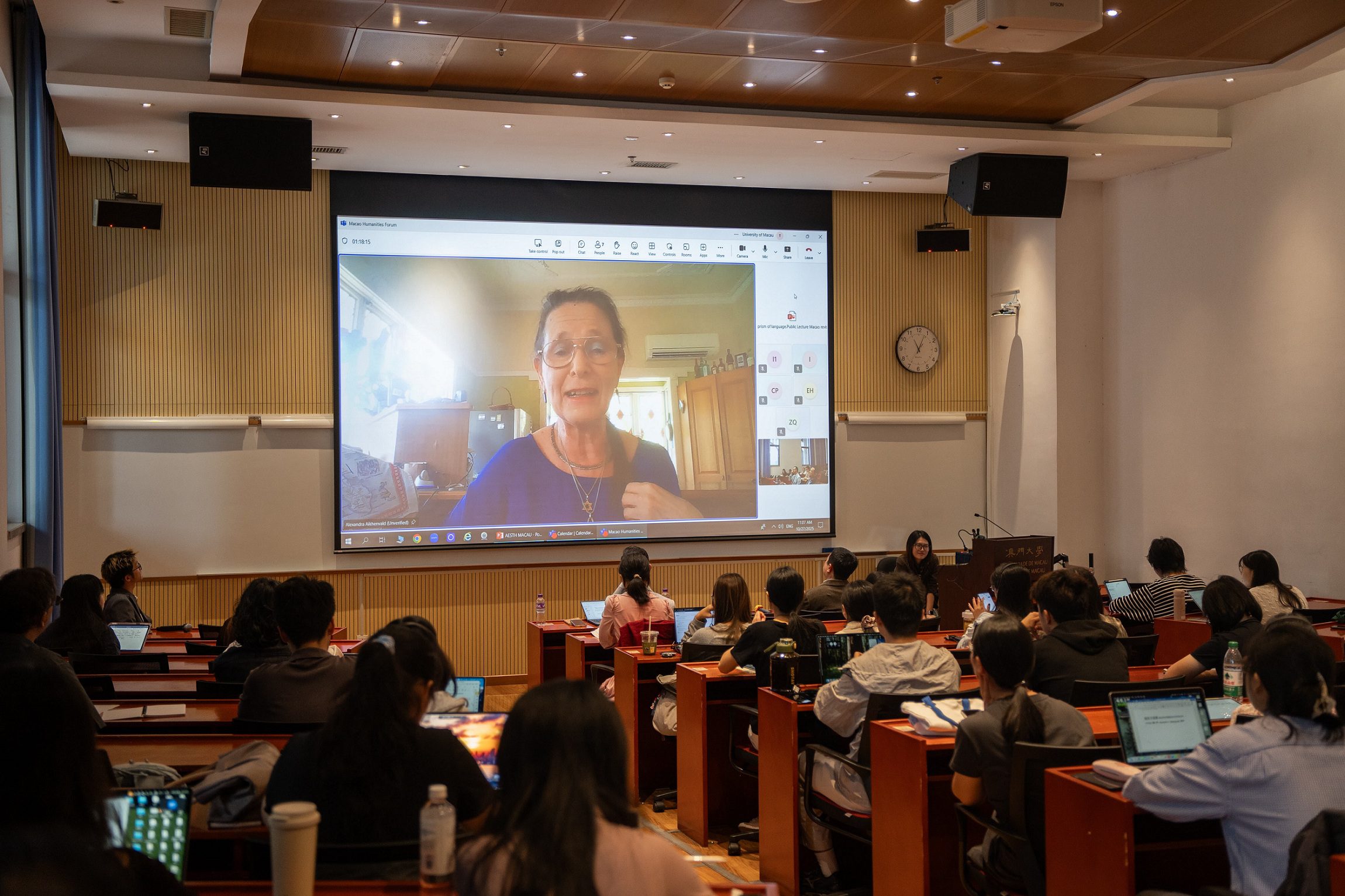 澳大人文學院助理院長鄺耀基致歡迎辭時指,是次論壇聚焦語言類型學,該學科致力於探索語言的結構多樣性及共性規律,幫助人們理解語言、認知、知識與文化的關係。澳大日文系主任楊文江介紹Aikhenvald的學術成就,表明其為國際知名的語言學家,在亞馬遜及巴布亞新幾內亞語言研究與語言類型學領域享有盛譽,主要研究方向包括示證範疇、量詞、語法性別、連動結構等;其代表作有Classifiers: A Typology of Noun Categorization Devices、How Gender Shapes the World等,均由牛津大學出版社出版;其開創性研究推動了語言類型學的發展,對語言學界影響深遠。