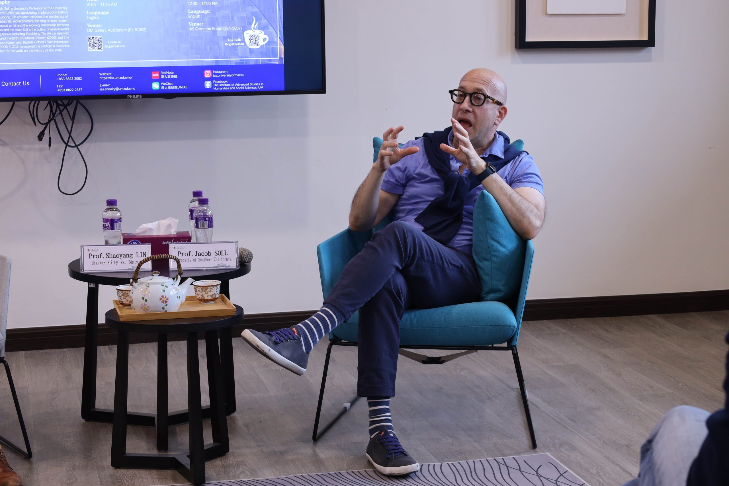 On December 10, the Institute of Advanced Studies in Humanities and Social Sciences (IAS) at University of Macau successfully hosted the tea talk session in conversation with Professor Jacob SOLL, who is a university professor and professor of Philosophy, History and Accounting at University of Southern California. Professor Shaoyang LIN, Head of Academic Programme and Publication of IAS, served as moderator. This event adopted an informal format, centering on in-depth communications and interactions among Professor Soll, UM scholars and students.