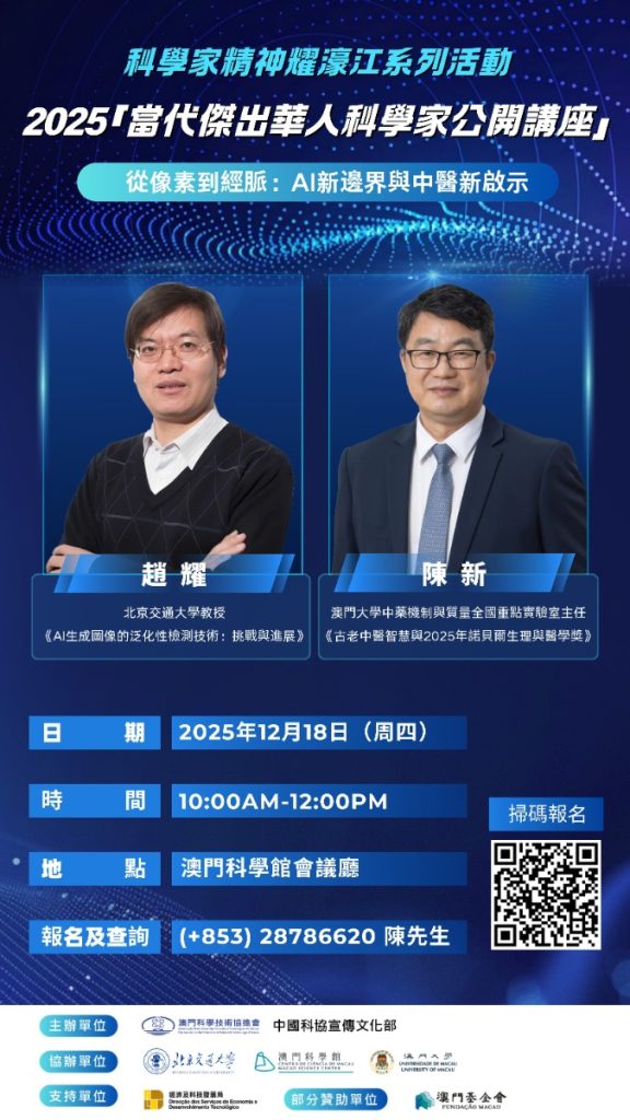 2025「當代傑出華⼈科學家公開講座」定於2025年12⽉18⽇(星期四)上午10時正假澳⾨科學館會議廳舉⾏,是次講座邀請了北京交通⼤學趙耀教授、澳⾨⼤學中藥質量研究國家重點實驗室陳新主任擔任演講嘉賓,分別演講《AI⽣成圖像的泛化性檢測技術:挑戰與進展》、《古老中醫智慧與2025年諾⾙爾⽣理與醫學獎》專題講座,向澳⾨⼤眾發表及分享最新的科技發展資訊與趨勢。