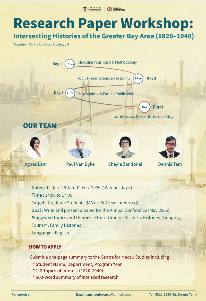 The Centre for Macau Studies (CMS) will conduct the ” Intersecting Histories of the Greater Bay Area (1820-1940) Research Paper Workshop“, aims to provide a platform to aid graduate students in choosing a research topic, with the following results: