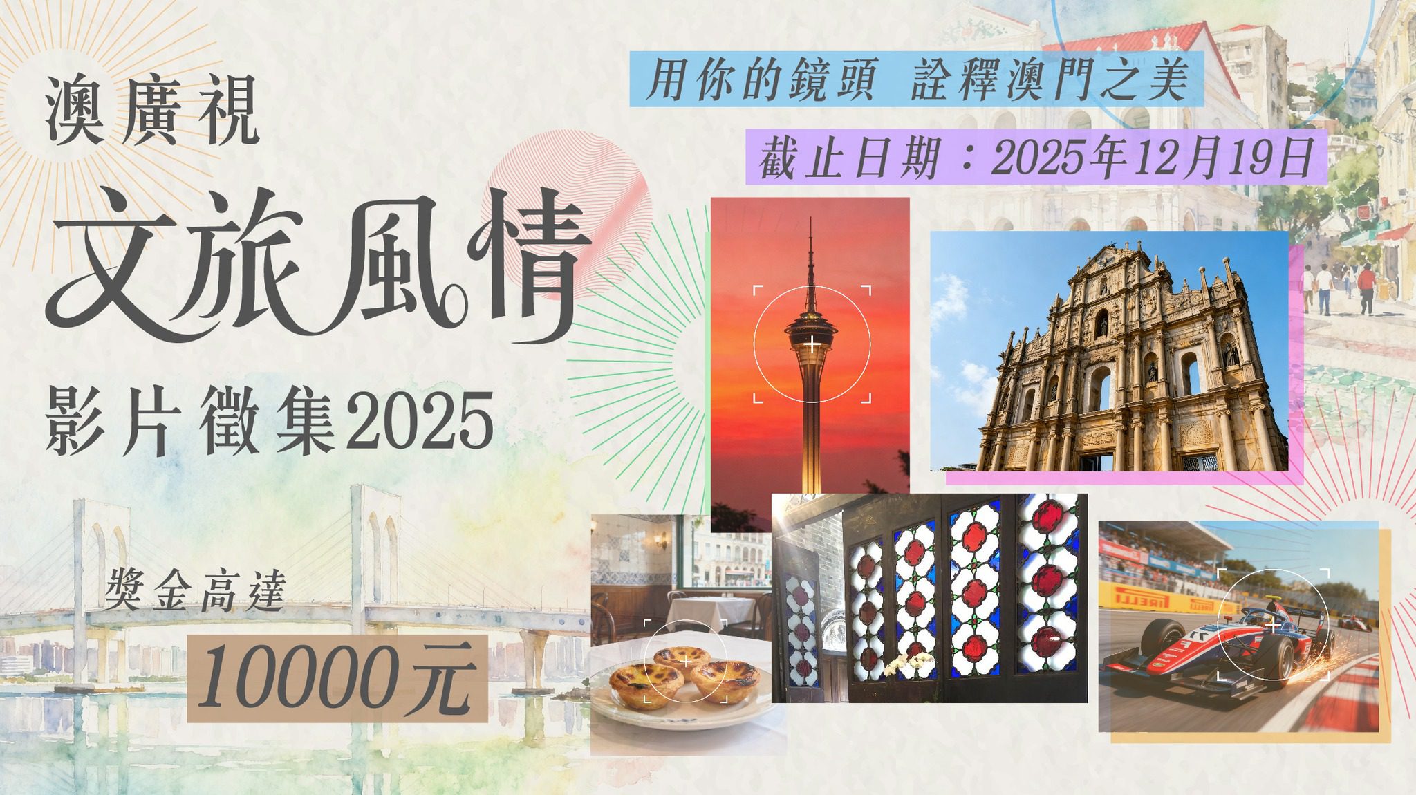 為推廣及宣傳澳門、並為本澳影視業界儲備人才、為製作人提供展示才華的機會,並藉着澳廣視落地中國內地全境及國家之優劫,向全世界觀眾展示澳門的風土人情,澳門廣播電視股份有限公司舉辦《澳廣視文旅風情影片徵集2025》活動,徵集以澳門文旅風情為主題之3分鐘影片,並評選出最多3 部優異作品及6部入圍作品,得獎者可獲豐富獎金。
