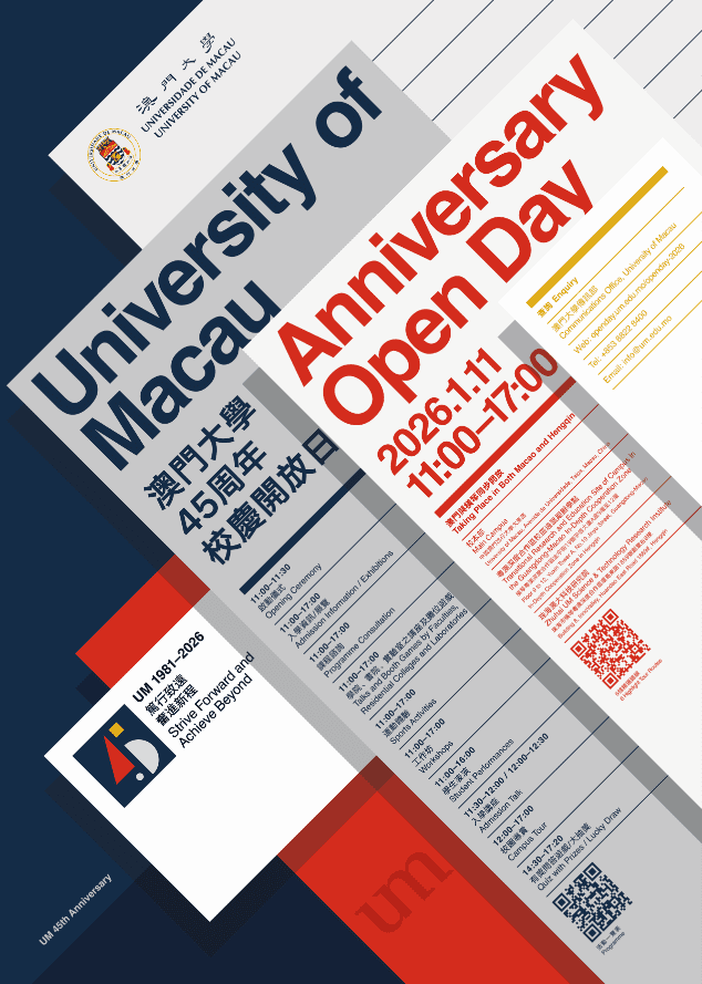 The year 2026 marks the 45th anniversary of the University of Macau (UM). To celebrate this important milestone, the university will hold the UM 45th Anniversary Open Day on 11 January 2026 (Sunday) from 11:00am to 5:00pm.