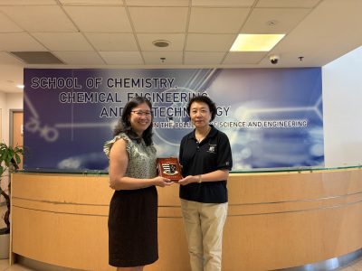 Photo 4 & 5: Visiting the School of Chemistry, Chemical Engineering and Biotechnology at Nanyang Technological University, and presenting a college souvenir to lab director Prof. Sierin Lim / 圖4及5:參觀南洋理工大學School of Chemistry, Chemical Engineering and Biotechnology,向實驗室負責人Prof. Sierin Lim致贈書院紀念品