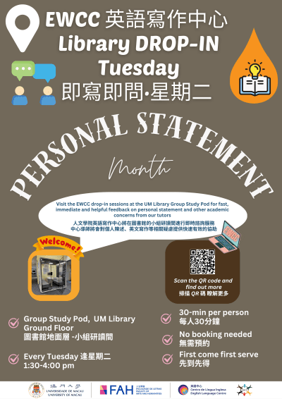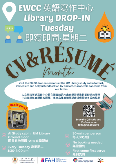 In collaboration with the UM Library, the EWCC organised regular library drop-in sessions to enhance the accessibility of academic support. A total of 11 library drop-in sessions were delivered during the semester, providing 27.5 service hours of student consultation. These sessions covered themes including CV writing, personal statements, and project and essay writing, which effectively addressed students’ concerns in the fall semester. The drop-ins also provided a convenient and accessible avenue for students to seek academic support in an informal and familiar study environment.