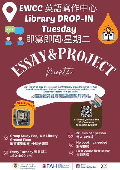 EWCC consultation service will start on January 13th, with library drop-in commencing after the Chinese New Year. In the new semester, EWCC will offer more regular speaking practice sessions, skill-based and exciting activities facilitated by different tutors. Stay tuned, join us in learning English and growing together in the new year with EWCC!