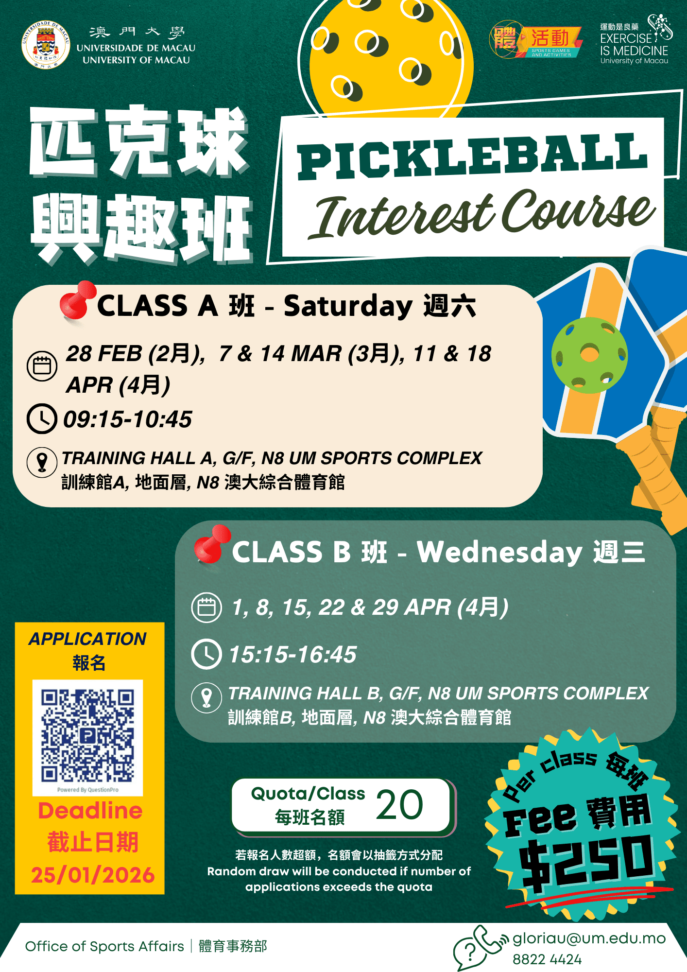 Sports: Sports Interest Courses for 2nd Semester of 2025/2026 – Pickleball (Application deadline: 25 JAN 2026)