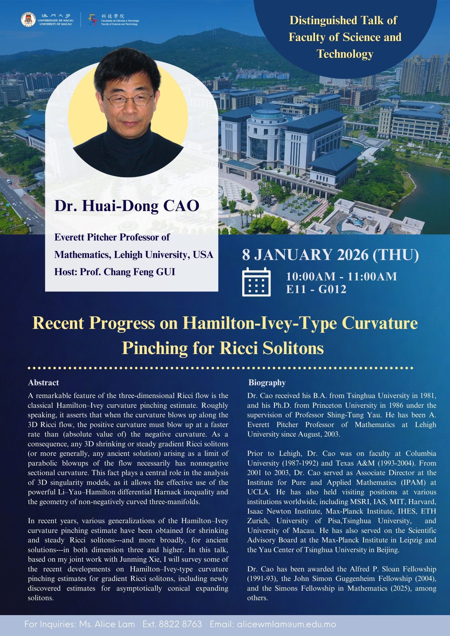 We are pleased to invite you to a distinguished seminar organized by the Faculty of Science and Technology. This special talk will feature Dr. Huai-Dong CAO, Everett Pitcher Professor of Mathematics at Lehigh University, who will share his profound insights and recent advancements in geometric analysis and Ricci solitons.