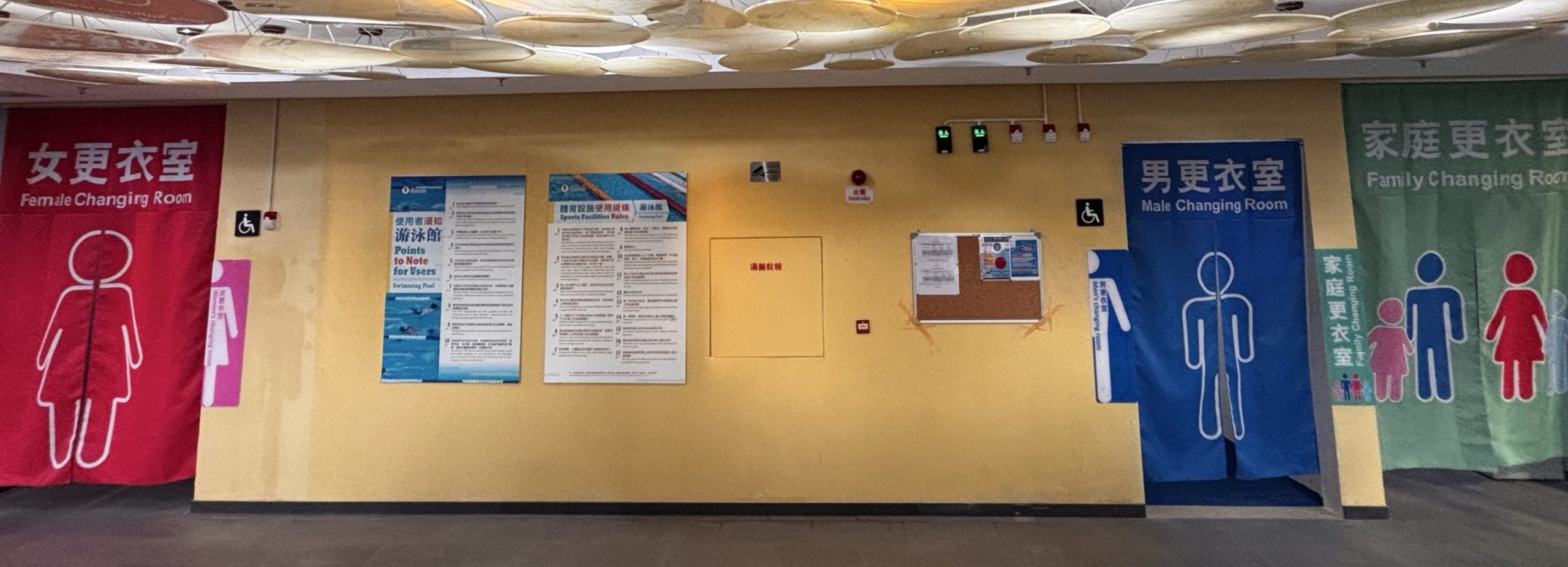 Due to construction work and to fit users’ needs, the original locations of the male and female changing rooms have been switched. Please take note. The current locations of the changing rooms are as follows (facing away from the swimming pool service counter, facing the changing rooms entrance):