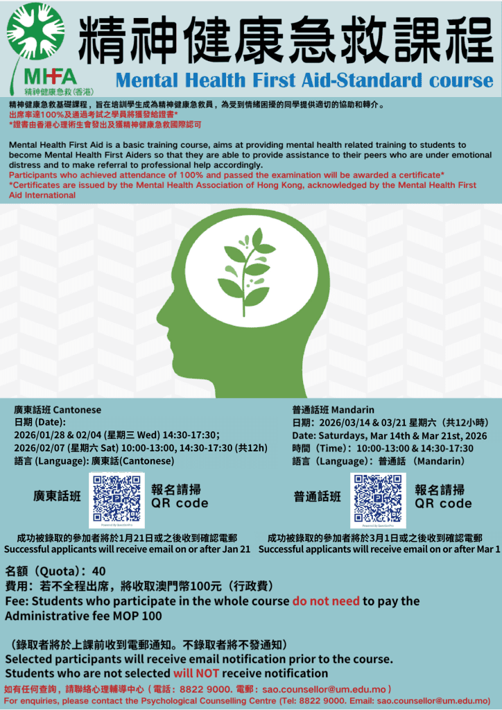 精神健康急救基礎課程,旨在培訓學生成為精神健康急救員,為受到情緒困擾的同學提供適切的協助和轉介。