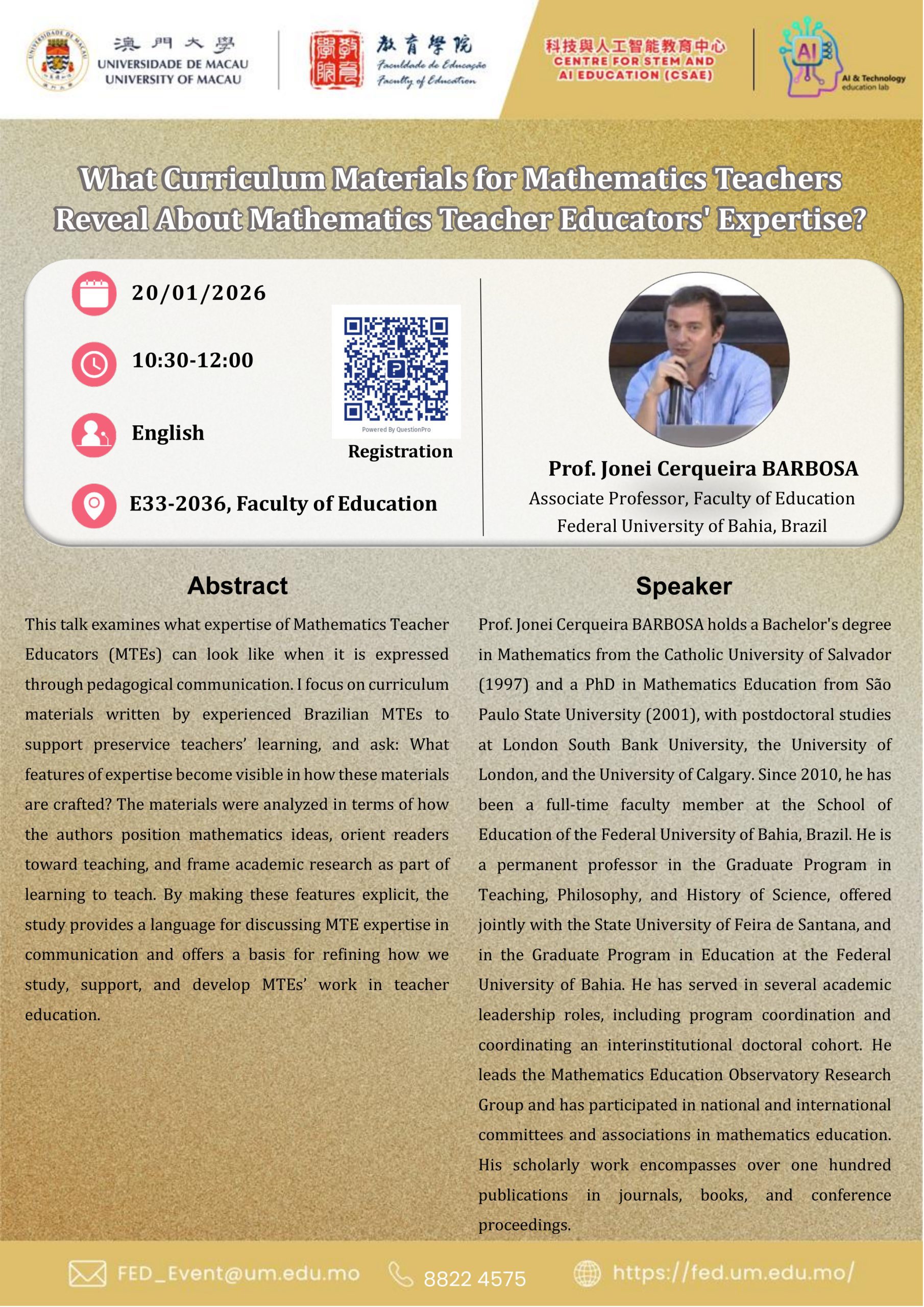 教育學院—科技與人工智能教育中心講座:"為數學教師設計的課程材料提示了數學教師教育者怎樣的專業素養?"