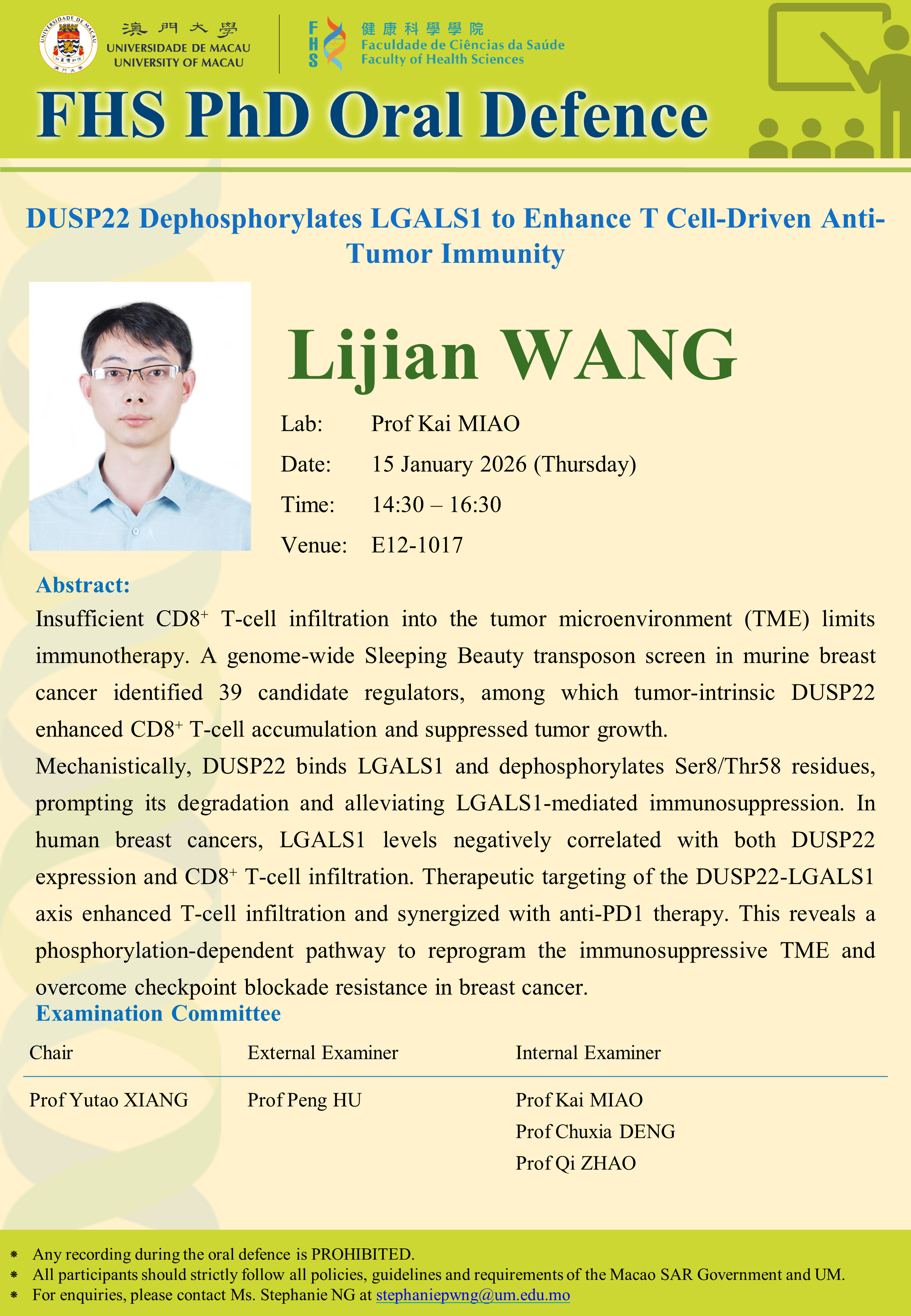 PhD Oral Defence in Faculty of Health Sciences, by Mr Lijian WANG on 15 January 2026 (Thursday)