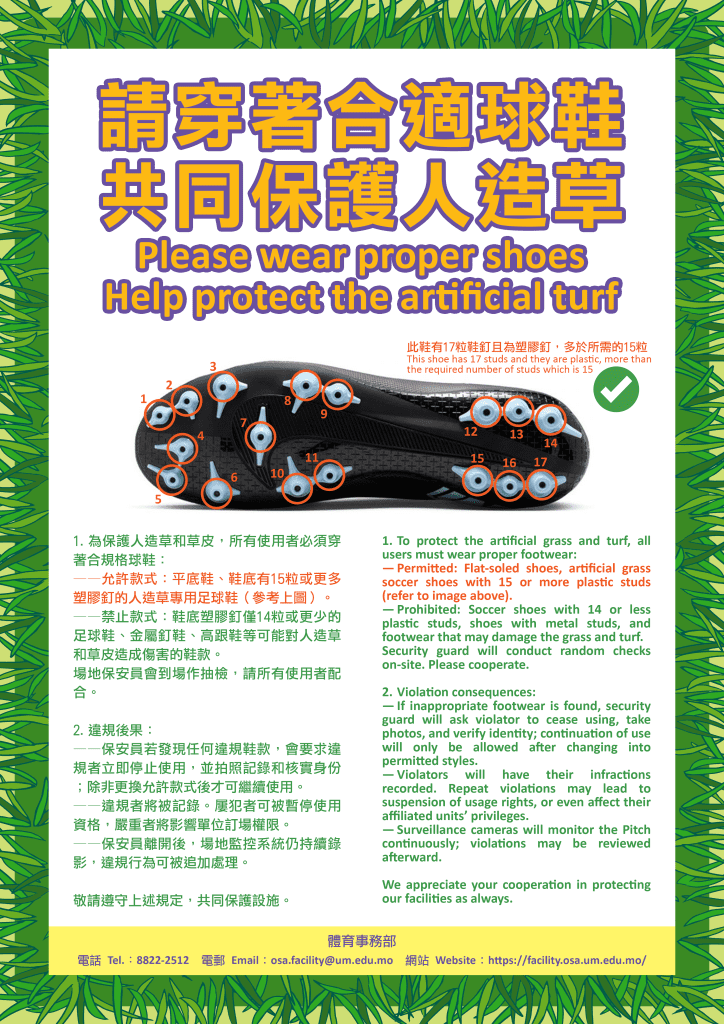 - 禁止款式:鞋底塑膠釘僅14粒或更少的足球鞋、金屬釘鞋、高跟鞋等可能對人造草和草皮造成傷害的鞋款。