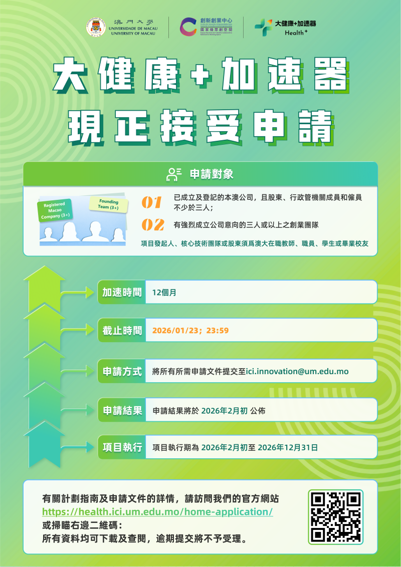 For details of the programme guidelines and application documents, please visit our official website: https://health.ici.um.edu.mo/home-application/ . All materials are available for download and review.