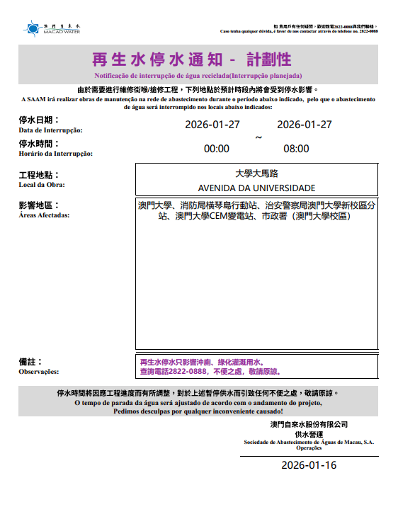 In preparation for the supply of recycled water to the campus of University of Macau on 1 March 2026, the Macao Water Supply Co. Ltd. (SAAM) will conduct dual-pipeline connection works and tests on 27 January 2026. During the works, campus recycled water supply will be suspended. Please conserve water. Water supply will be resumed as soon as the works are completed.