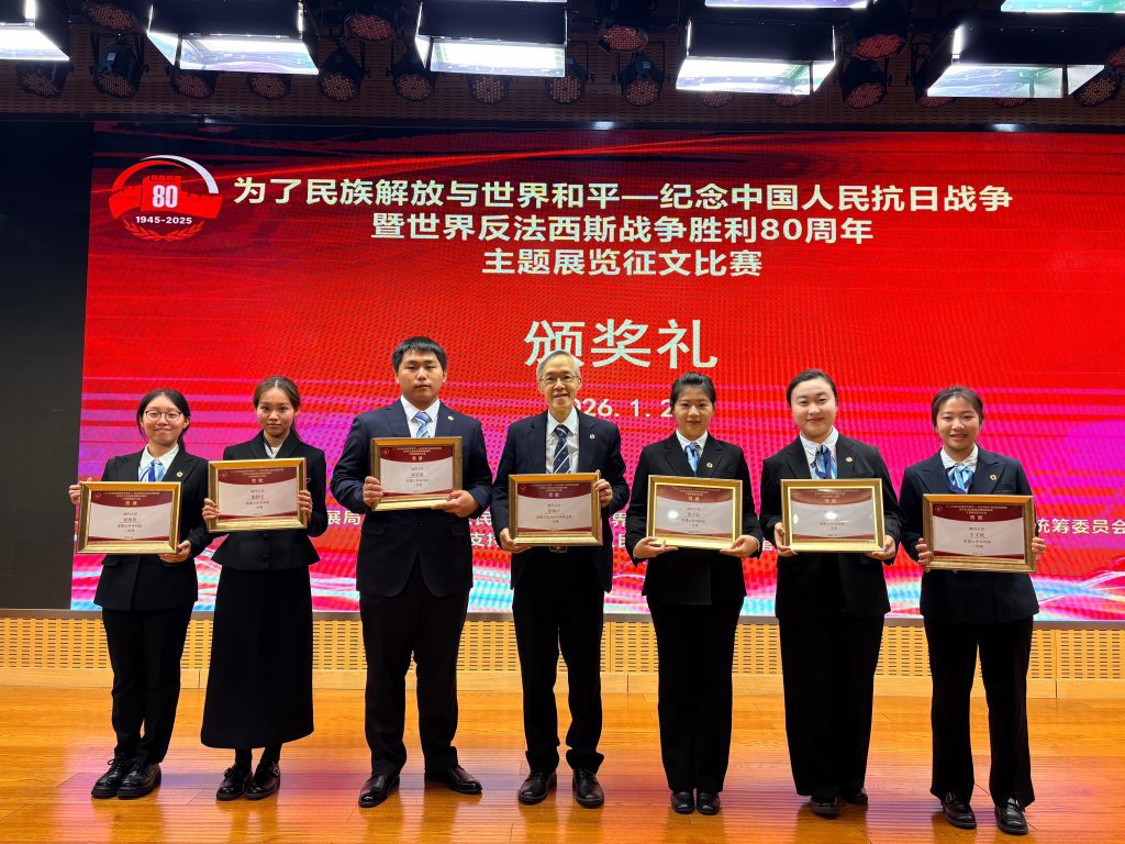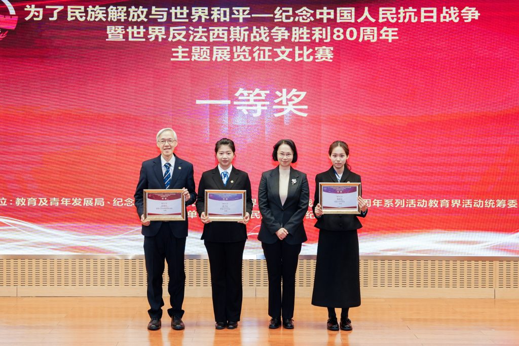 是次比賽由澳門特別行政區政府教育及青年發展局以及紀念中國人民抗日戰爭暨世界反法西斯戰爭勝利80周年系列活動教育界活動籌備委員會主辦。澳大共有18名學生獲得多項殊榮,包括兩項一等獎、一項二等獎、三項三等獎、五項優異獎及七項入圍獎;指導老師、澳大學生事務長彭執中亦榮獲指導老師一、二、三等獎。澳大師生於日前赴北京參與比賽頒獎典禮,師生攜手登台,共獲殊榮,成果豐碩。