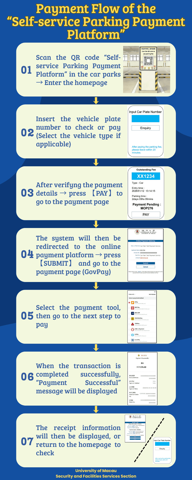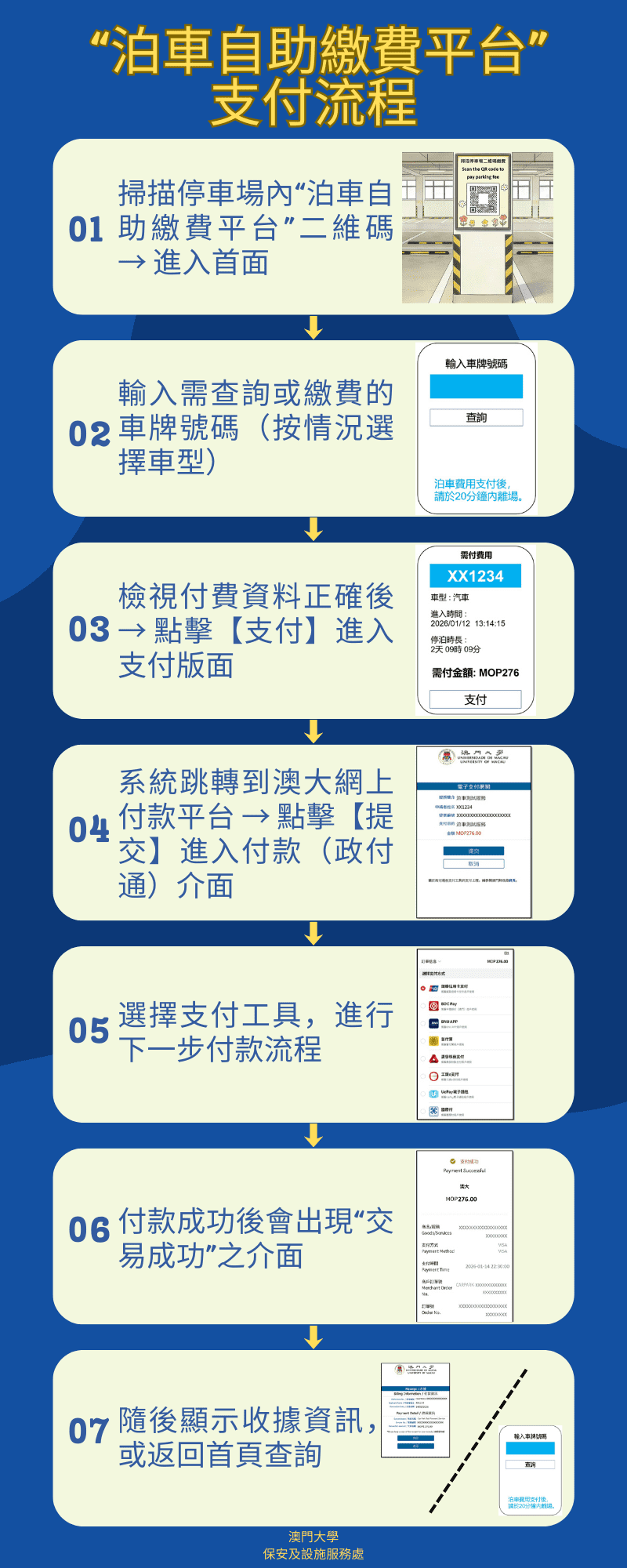 茲通知由2026年2月26日至3月20日期間,澳門大學所有訪客停車場(P1A、P1、P3、P5及P6)將正式轉用車牌識別系統(包括汽車及電單車*)進出上述停車場。