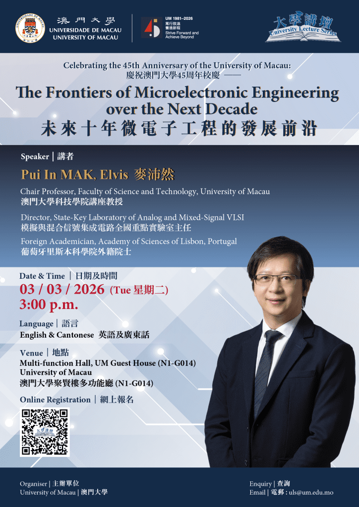 (3 Mar, 3:00 pm) Invitation: Celebrating the 45th Anniversary of the University of Macau: “University Lecture Series: The Frontiers of Microelectronic Engineering over the Next Decade” by Elvis MAK, Chair Professor of Faculty of Science and Technology, University of Macau [1 Smart Point, 15 CS]