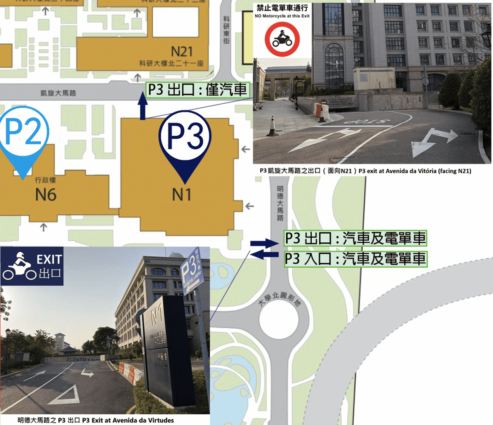 二、 靠近凱旋大馬路(面向N21)的訪客停車場P3出口調整為僅供汽車使用。電單車使用者請使用靠近明德大馬路的出口離場。