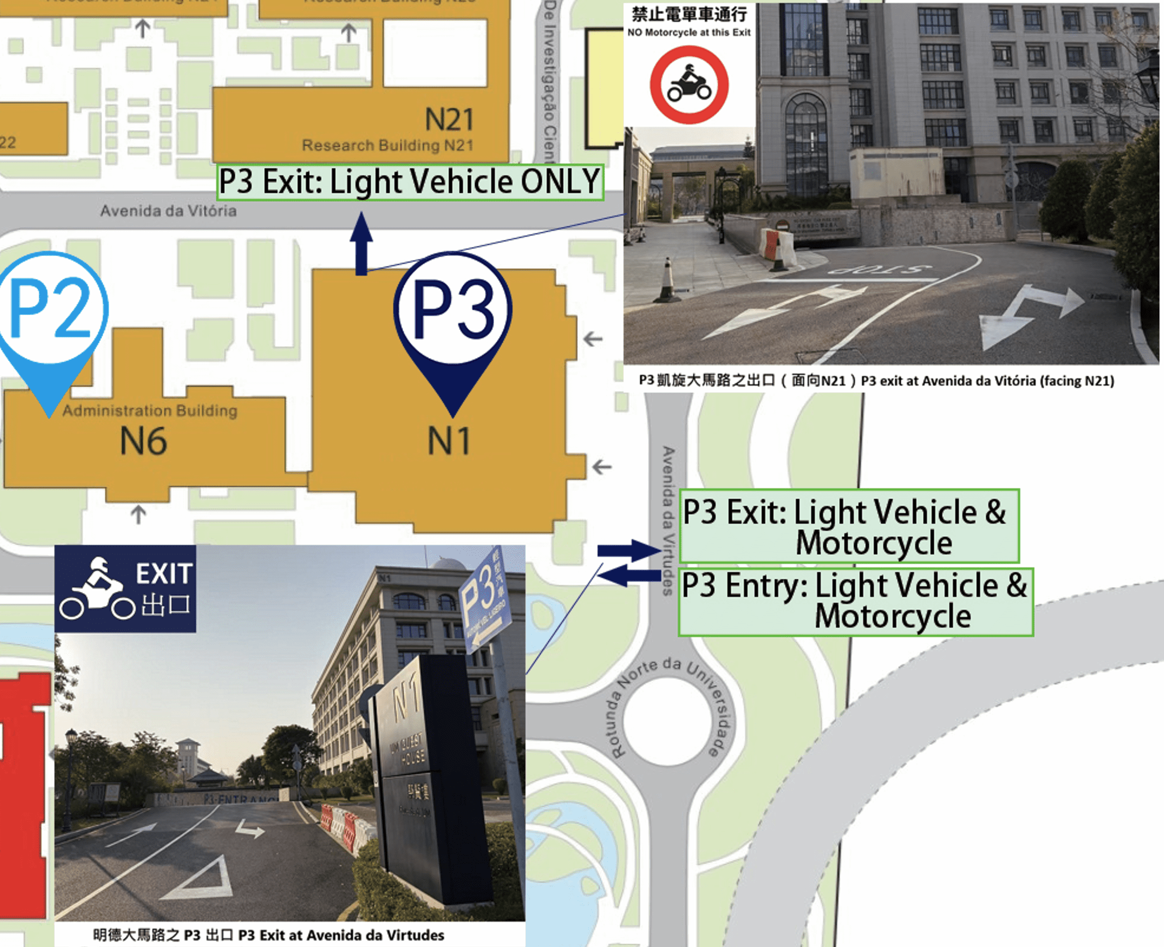 - The exit of Visitor Car Park P3 near Avenida da Vitória (facing N21) will be designated for light vehicles only. Motorcyclists should use the exit near Avenida da Virtudes when leaving the car park.