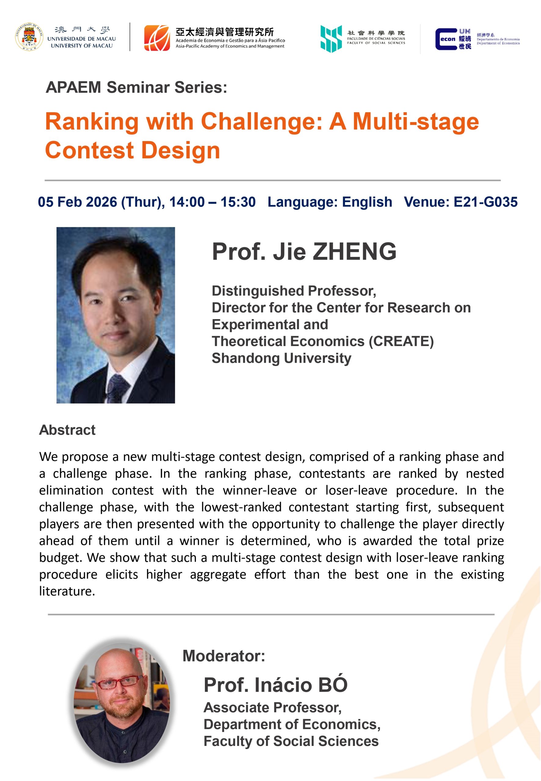 APAEM would like to invite you to our latest seminar “Ranking with Challenge: A Multi-stage Contest Design” on Feb 05 (Thur), 2026 with the following details: