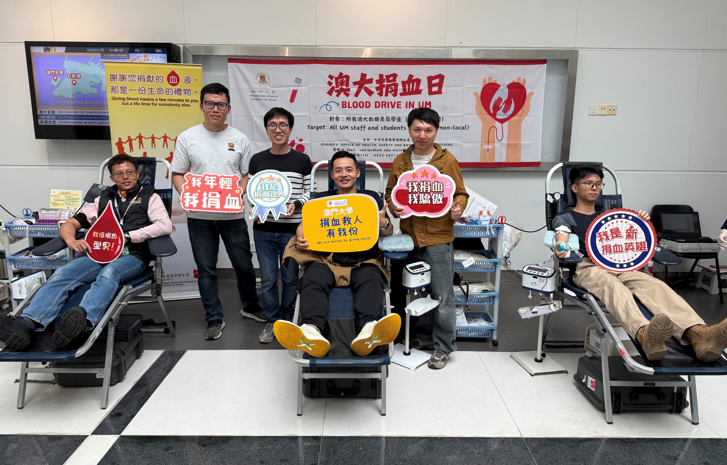 Office of Health, Safety and Environmental Affairs jointly organized the first UM Blood Drive for this semester in E4 (GF lobby) on 30 January with Blood Transfusion Service of Health Bureau. Thank you for the great support from the donors. The second and third blood drive activities will be held on 26 March and 23 April. We look forward to your participation.