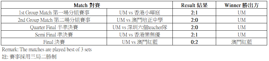 UM Women’s Volleyball Team has participated in “2026 Volleyball League of Shenzhen Starleap Club ” which was held on 1 Feb in Shenzhen. There were over 160 athletes participating in this tournament and the participating teams were came from Hong Kong, Macao, Shenzhen and Zhongshan respectively. At last, UM Women’s Volleyball Team got 1st runner-up in this competition. Through this exchange activity, UM students had a great opportunity for promoting UM to other places as well as interacting with volleyball players from different regions.