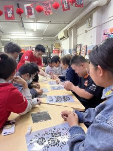 活動前一日,小組成員已集中進行演練,並提前準備好金箔紙、黑色卡紙、圖案卡及相關輔助工具。活動當日,隨著孩子們陸續到場,志願者引導他們逐步投入手工製作。在輕鬆愉快的氛圍中,雙方迅速建立起默契與信任。