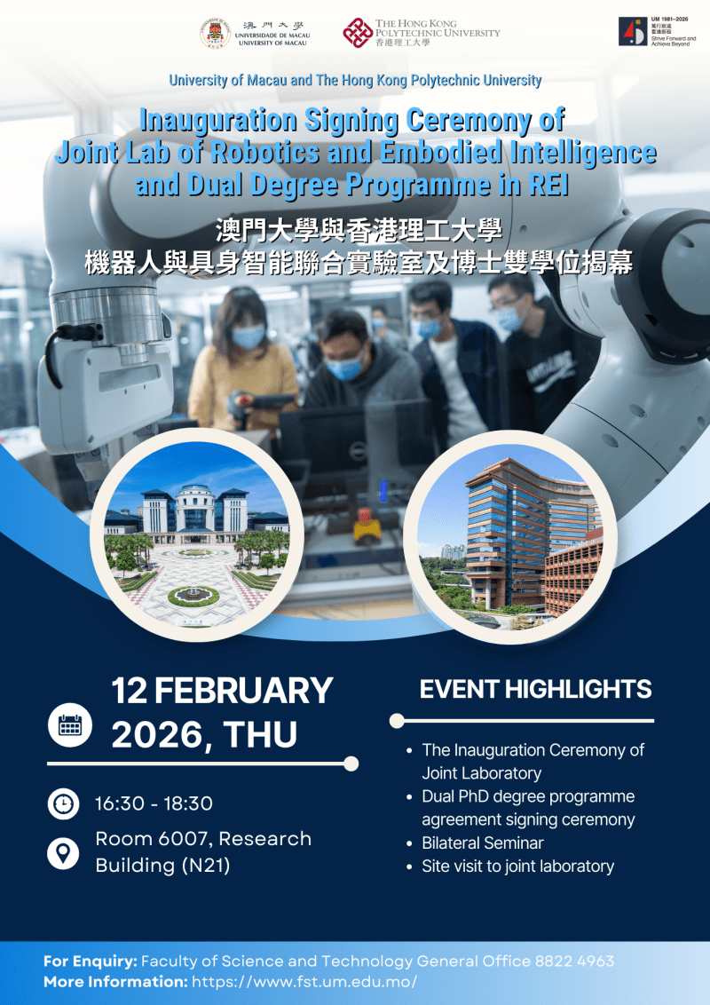 【誠摯邀請】澳門大學與香港理工大學機器人與具身智能聯合實驗室及博士雙學位揭幕儀式(2026年2月12日 16:30)