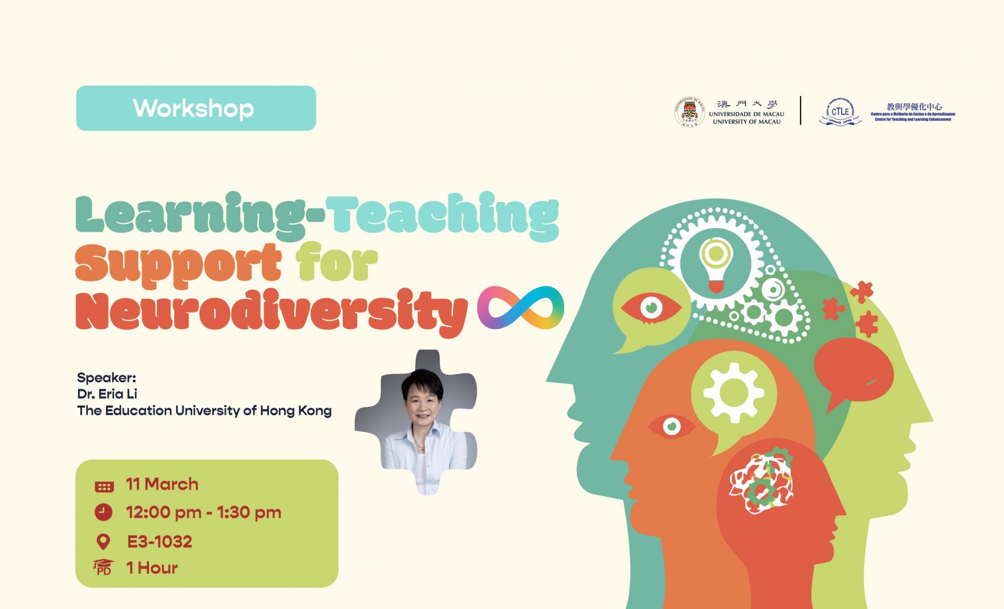 The Centre for Teaching and Learning Enhancement (CTLE) would like to cordially invite you to take part in the CTLE Professional Development Workshop: Learning-Teaching Support for Neurodiversity with Dr. Eria Li from The Education University of Hong Kong.