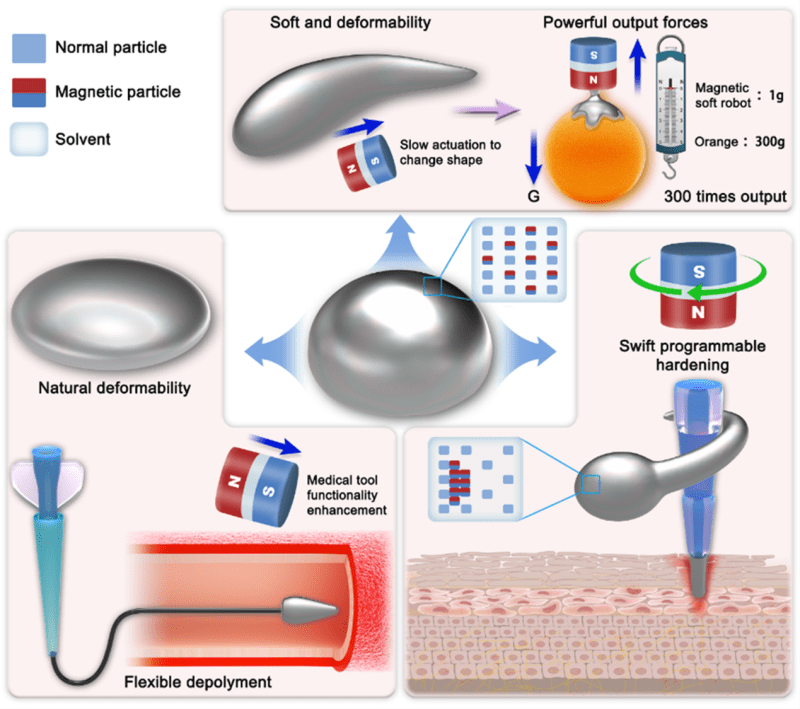 Schematic diagram of a magnetically controlled on-demand hardening high force-output soft medical microrobot
