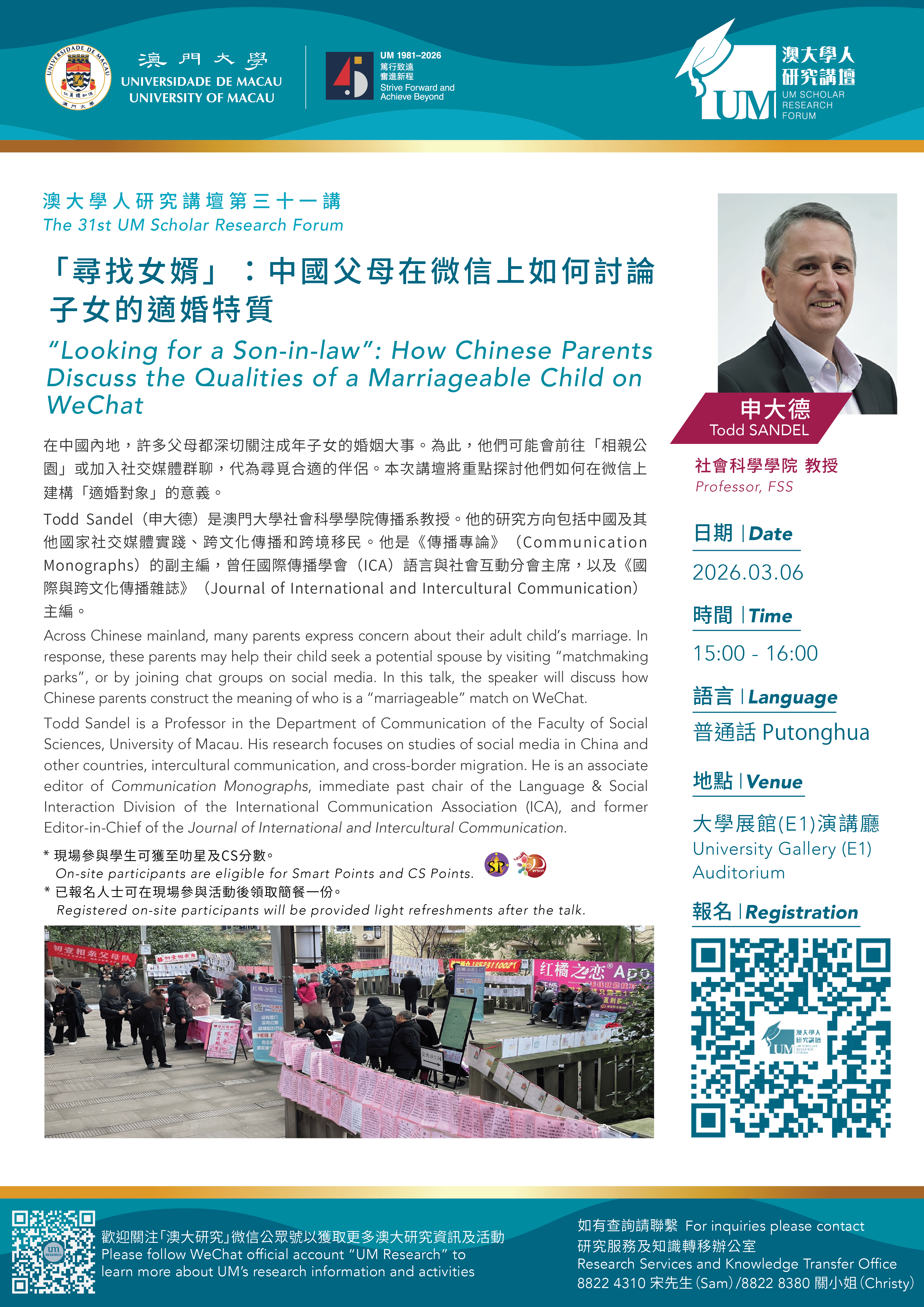 The 31st UM Scholar Research Forum: “Looking for a Son-in-law”: How Chinese Parents Discuss the Qualities of a Marriageable Child on WeChat [Light Refreshments & 0.5 Smart Point & 10 CS Points]