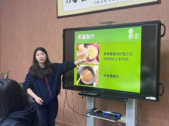 At the beginning of the workshop, the presenter first elaborated on the global issue of food waste and the significance of kitchen waste recycling. Then, step-by-step demonstrations of jam cooking and eco-enzyme preparation were provided, covering key procedures such as ingredient selection, washing, dicing, proportional mixing of sugar and peels, and sealed fermentation. Participants worked in groups to complete the jam boiling and enzyme bottling under professional guidance, while exchanging daily tips on plastic reduction and leftover handling.