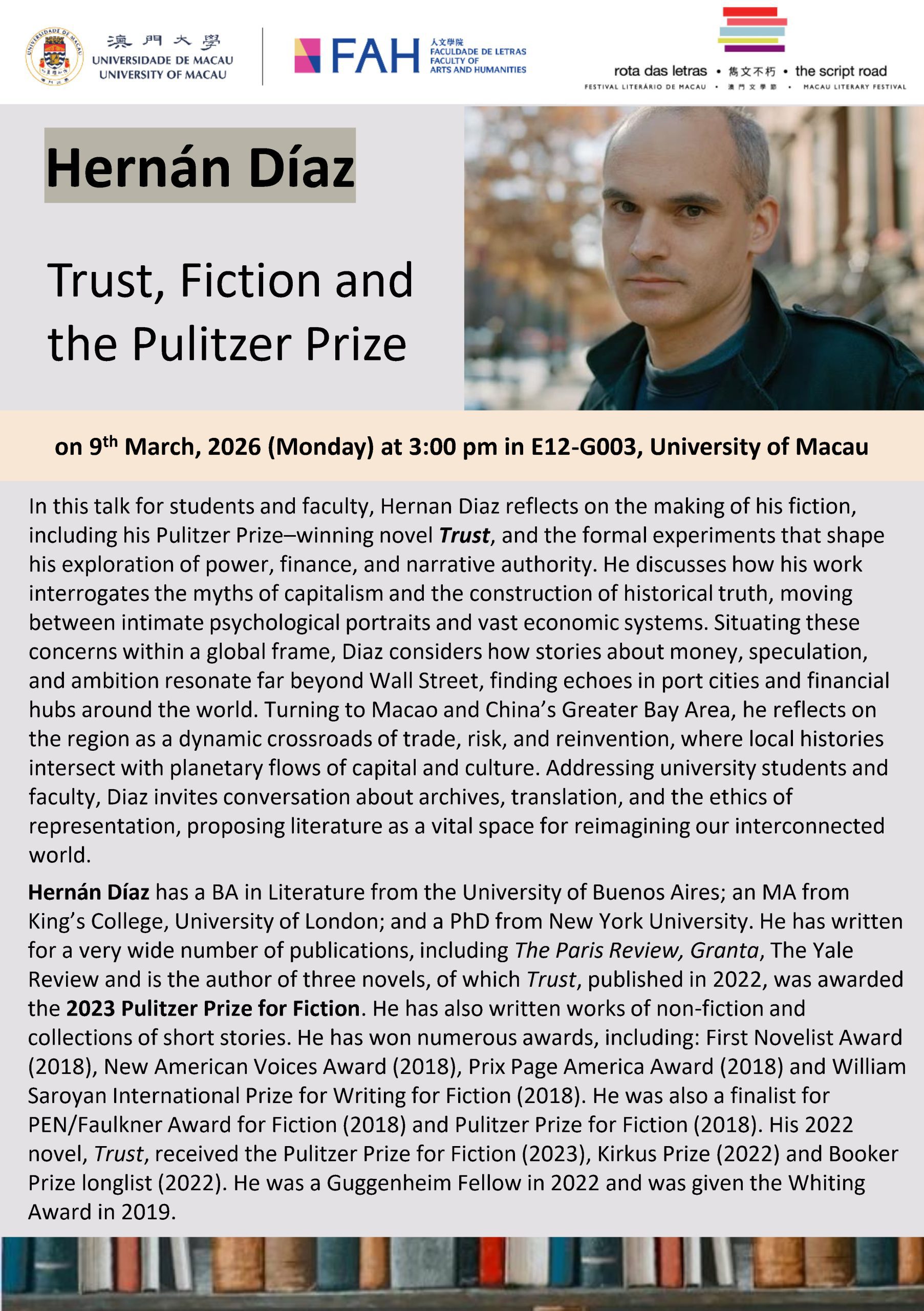 In this talk for students and faculty, Hernan Diaz reflects on the making of his fiction, including his Pulitzer Prize–winning novel Trust, and the formal experiments that shape his exploration of power, finance, and narrative authority. He discusses how his work interrogates the myths of capitalism and the construction of historical truth, moving between intimate psychological portraits and vast economic systems. Situating these concerns within a global frame, Diaz considers how stories about money, speculation, and ambition resonate far beyond Wall Street, finding echoes in port cities and financial hubs around the world. Turning to Macao and China’s Greater Bay Area, he reflects on the region as a dynamic crossroads of trade, risk, and reinvention, where local histories intersect with planetary flows of capital and culture. Addressing university students and faculty, Diaz invites conversation about archives, translation, and the ethics of representation, proposing literature as a vital space for reimagining our interconnected world.