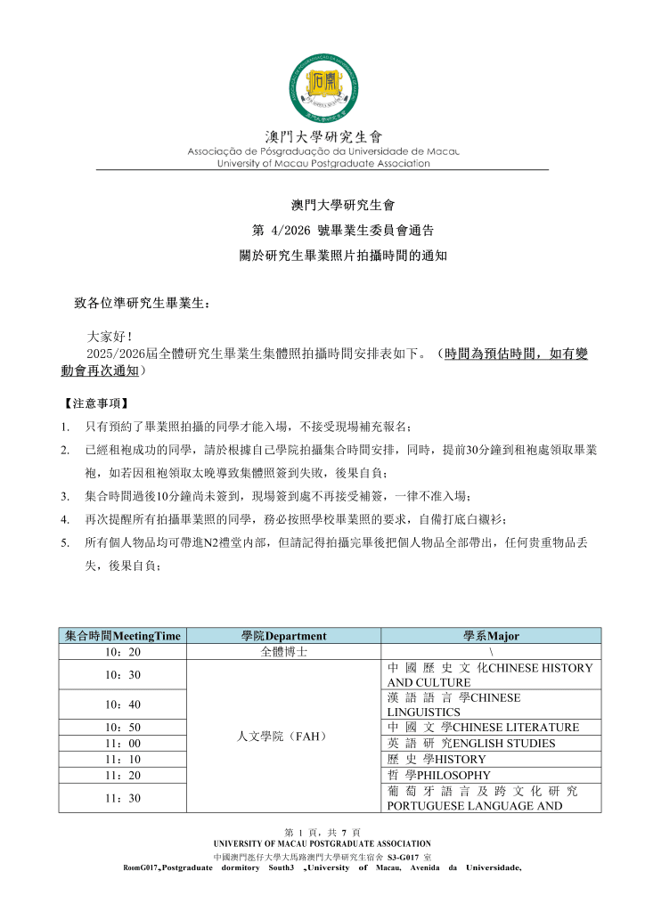 [溫馨提示] 澳門大學研究生會畢業生委員會通告:2025/2026年度 關於"研究生畢業照拍攝及繳費"和"研究生畢業袍租借"通知