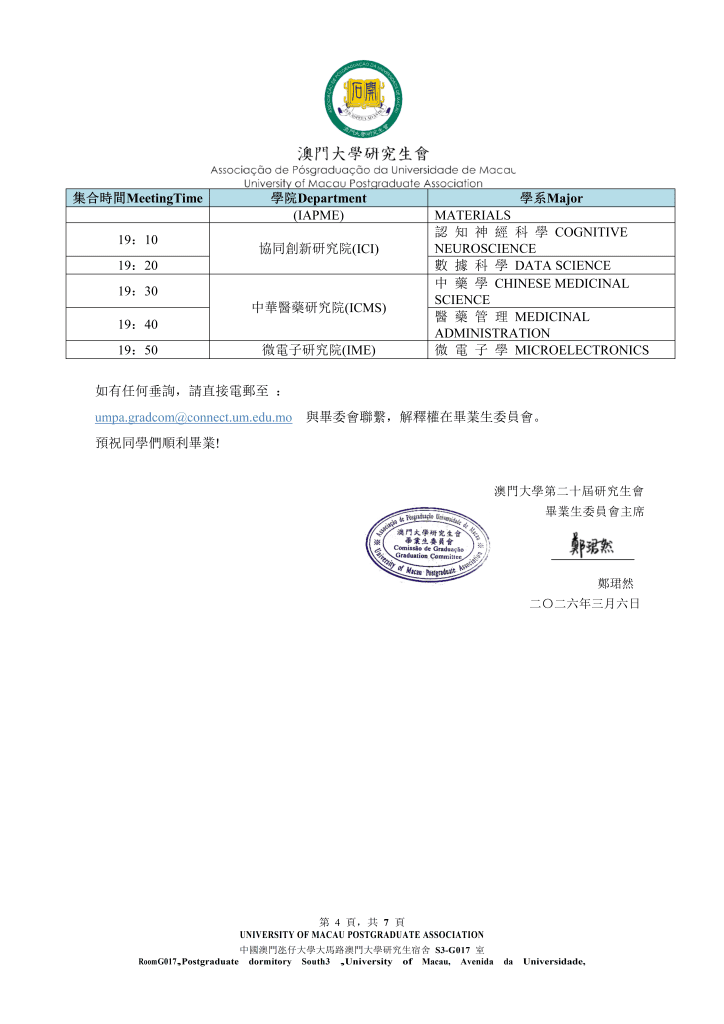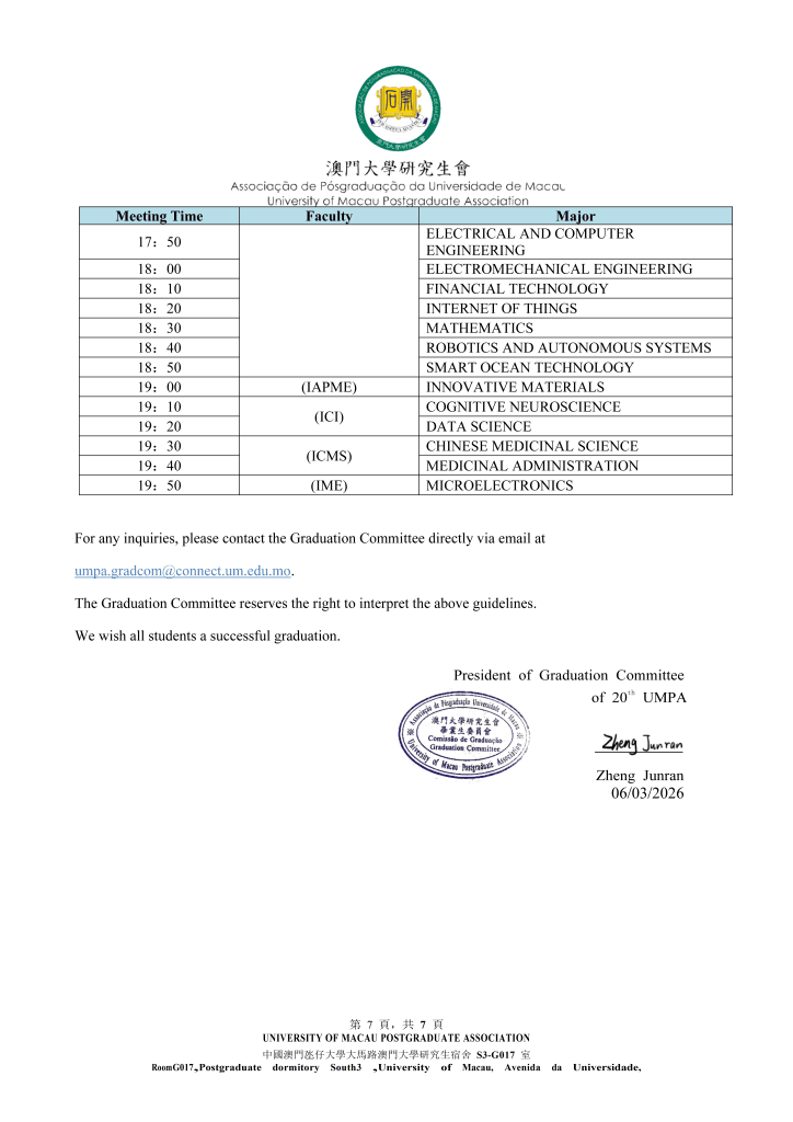 For any inquiries, please contact umpa.gradcom@um.edu.mo, or contact graduation representatives. Thank you for your cooperation. The right of interpretation belongs to the Graduation Committee.