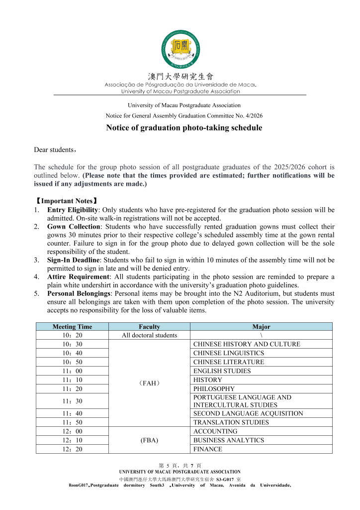 Greetings! How time flies and here comes the graduation season! Congratulations for your graduation! The graduation photo shoot of the 2025/2026 postgraduates of the University of Macau will be taken on March 29, 2026. Details are as follows: