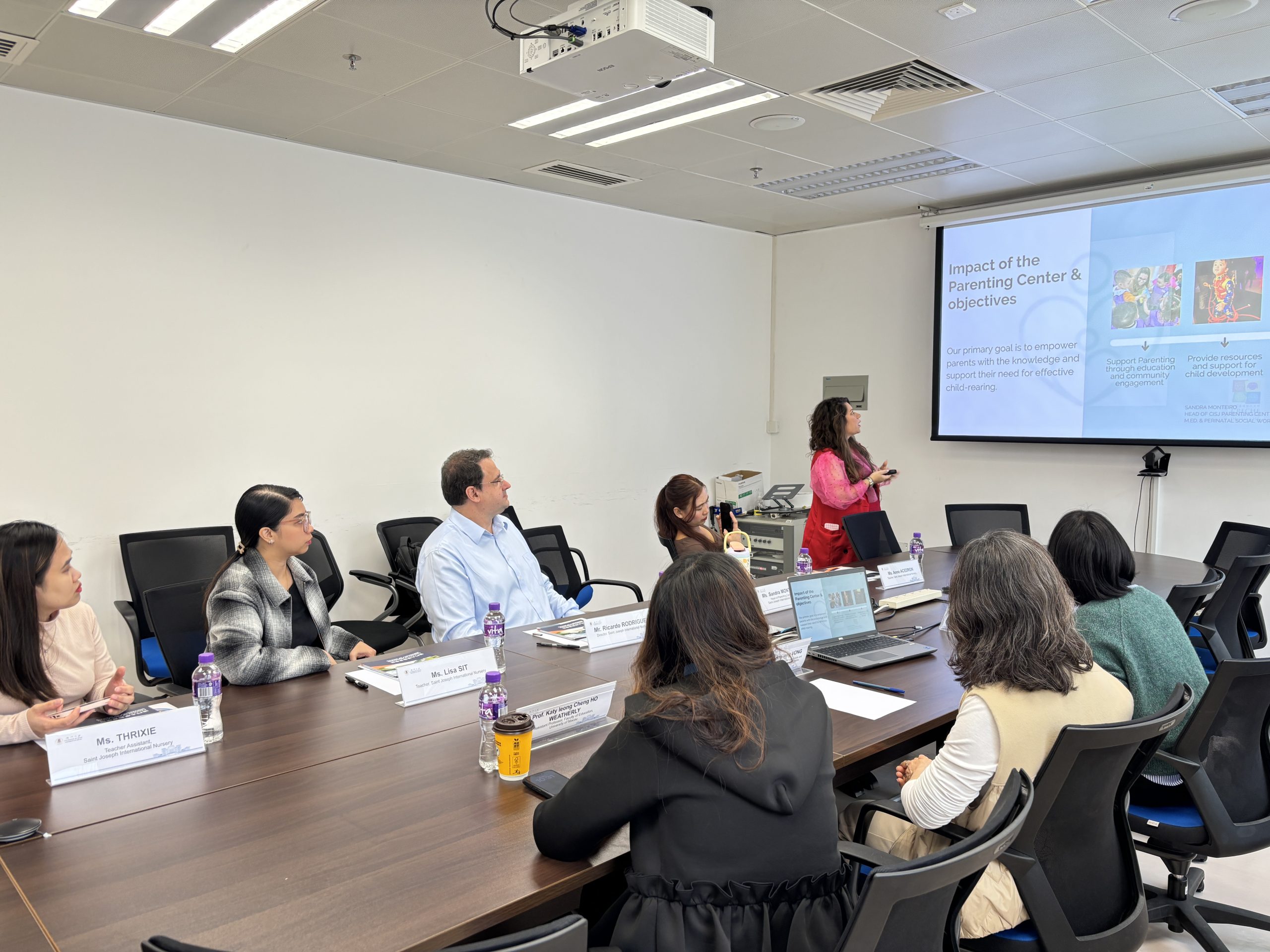 教育學院助理院長(學校協作與對外關係)黃鏡英教授、教育學士學位(學前教育)課程統籌人孫瑾教授,以及何揚晴教授接待到訪代表團。聖若瑟國際托兒所代表團成員包括: Ricardo RODRIGUES先生、Sandra MONTEIRO女士及三位教職員。