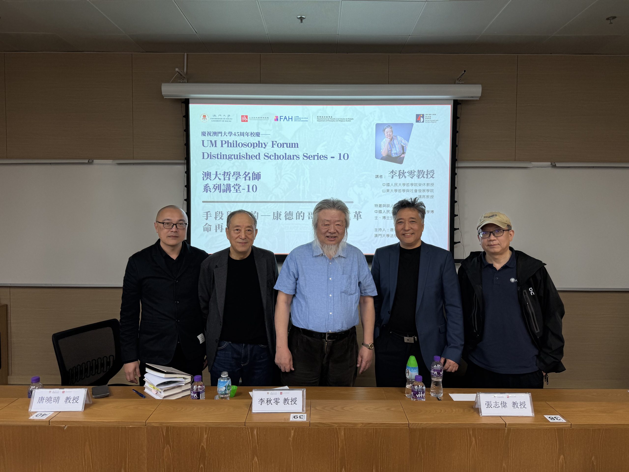 由澳門大學人文社科高等研究院、人文學院哲學與宗教學系共同舉辦的「澳大哲學名師系列講堂—第十講」於2026年3月13日下午在人文社科樓(E21A-G049)順利舉行。本次講座特邀中國人民大學哲學院榮休教授、山東大學哲學與社會發展學院講席教授李秋零教授擔任主講人,主題為「手段與目的—康德的哥白尼式革命再審視」。講座由澳門大學法學院院長及教授唐曉晴教授主持,並邀請中國人民大學哲學院教授、哲學博士、博士生導師張志偉教授擔任與談人。