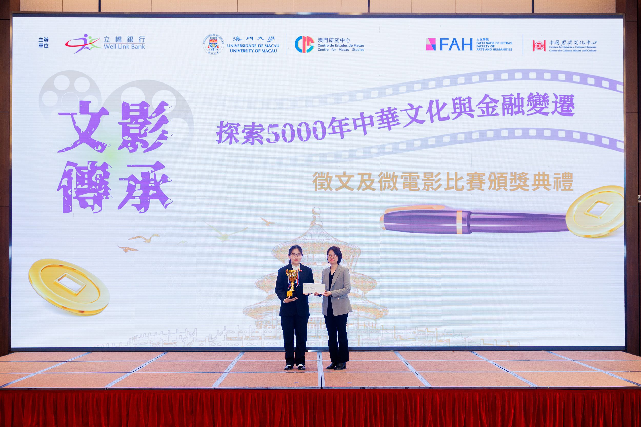 澳門大學學生在“文影傳承:探索5000年中華文化與金融變遷”徵文及微電影比賽中表現出色,在徵文比賽大專組分別奪得冠軍和亞軍。
