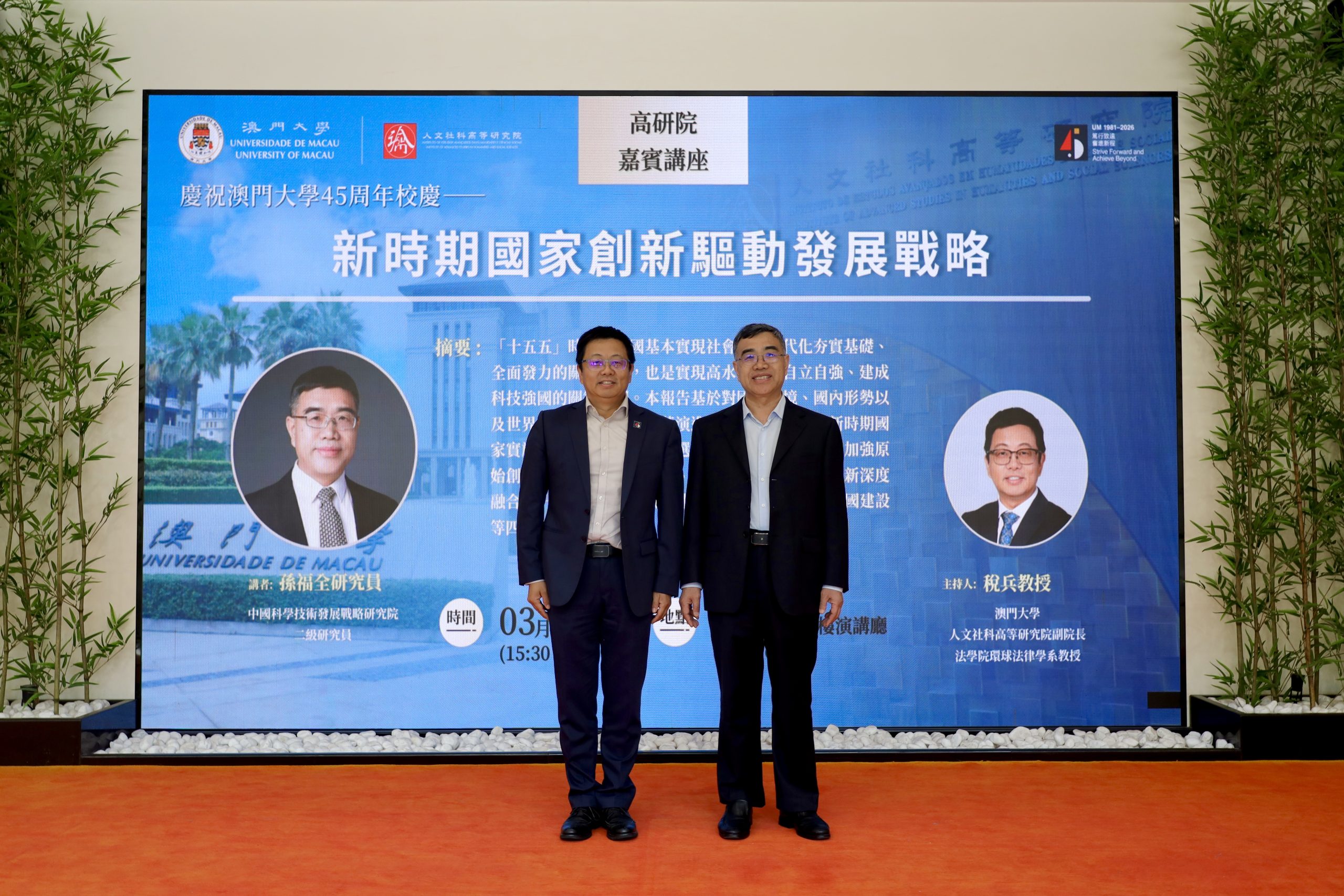 On March 13, 2026, the Institute of Advanced Studies in Humanities and Social Sciences (IAS) of the University of Macau held a guest lecture featuring Dr. Fuquan Sun, former Vice President of the Chinese Academy of Science and Technology for Development (CASTED) and Grade II Research Fellow at the Ministry of Science and Technology, who delivered a talk entitled “National Innovation-Driven Development Strategy in the New Era”. The event was part of the University of Macau’s 45th-anniversary celebrations and was moderated by Professor Bing Shui, Associate Director of the IAS and Professor in the Department of Global Legal Studies, Faculty of Law, University of Macau.
