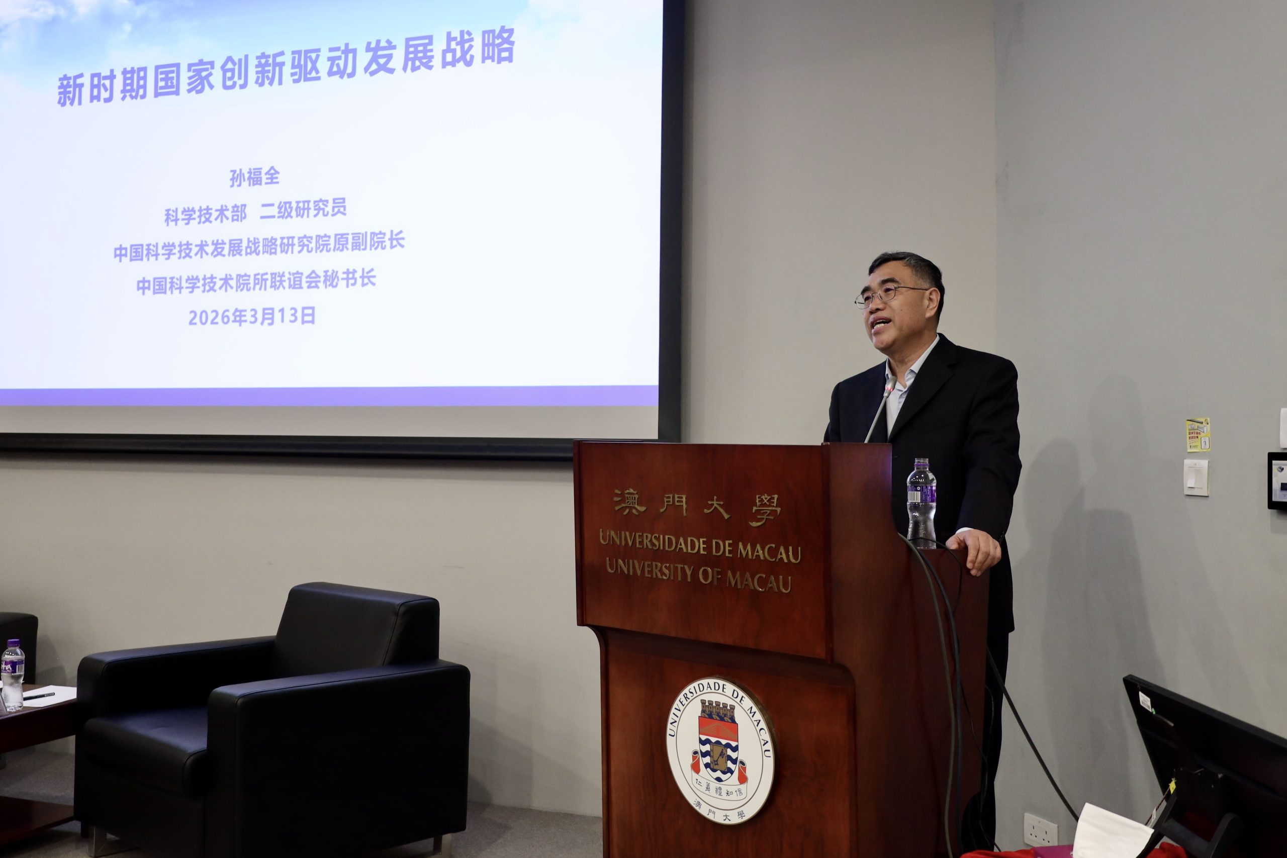 2026年3月13日,澳門大學人文社科高等研究院(高研院)舉行嘉賓講座,邀請中國科學技術發展戰略研究院原副院長、科學技術部二級研究員孫福全,以「新時期國家創新驅動發展戰略」為題作專題分享。本次講座為澳門大學45周年校慶系列活動之一,由高研院副院長、法學院環球法律學系教授稅兵主持。