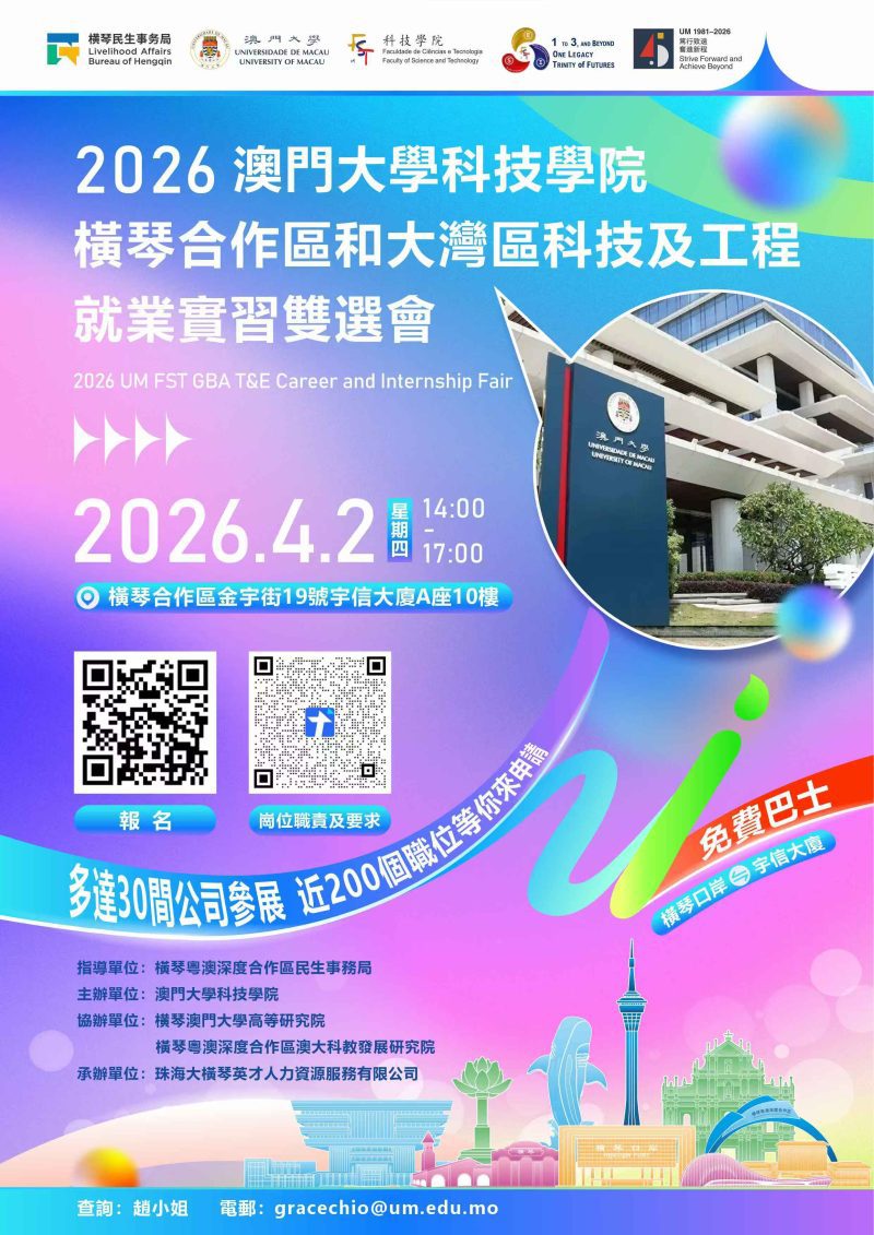 We are pleased to invite you to the 2026 UM Faculty of Science and Technology (FST) Hengqin Cooperation Zone and Greater Bay Area (GBA) Technology & Engineering Career and Internship Fair, organized by the Faculty of Science and Technology, University of Macau. This event aims to provide our students with opportunities for face-to-face interaction with key enterprises in the Greater Bay Area, featuring nearly 200 positions including full-time roles and internships. Local and non-local students are welcome! Please prepare your CV in advance!