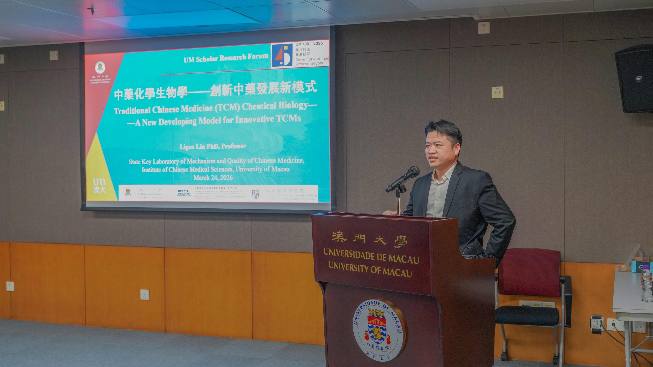 The University of Macau (UM) held the 32nd UM Scholar Research Forum today (24 March), where Lin Ligen, professor in the Institute of Chinese Medical Sciences and the State Key Laboratory of Mechanism and Quality of Chinese Medicine and associate head of the Department of Pharmaceutical Sciences in the Faculty of Health Sciences at UM, delivered a talk titled ‘Traditional Chinese Medicine (TCM) Chemical Biology: A New Developing Model for TCM Innovation’. The talk was well attended by students, faculty, and members of the public.