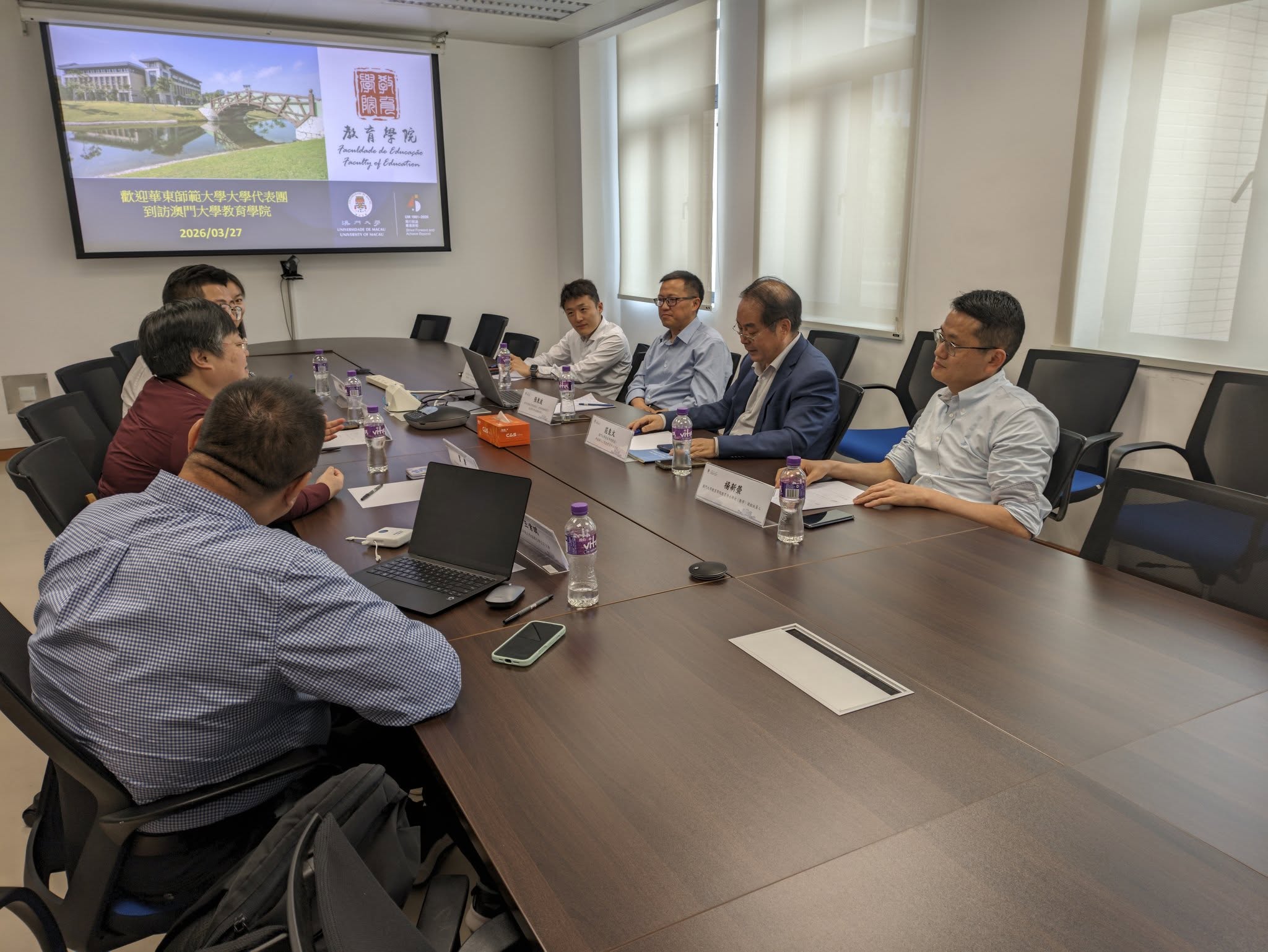 2026年3月27日,華東師範大學代表團到訪澳門大學教育學院,受到院長兼科技與人工智能教育中心主任范良火教授、副院長(教學及課程發展)兼教育博士學位課程統籌人張東波教授、教育學學士學位課程統籌人(數學)楊新榮教授,以及科技與人工智能教育中心助理主任兼人工智能教育實驗室主任陳孚教授的熱情接待。