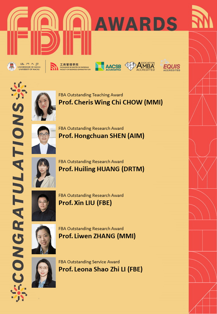 From different departments of FBA, Prof. Hongchuan SHEN, Prof. Huiling HUANG, Prof. Xin LIU, and Prof. Liwen ZHANG demonstrated their research excellence and received the FBA Outstanding Research Awards.