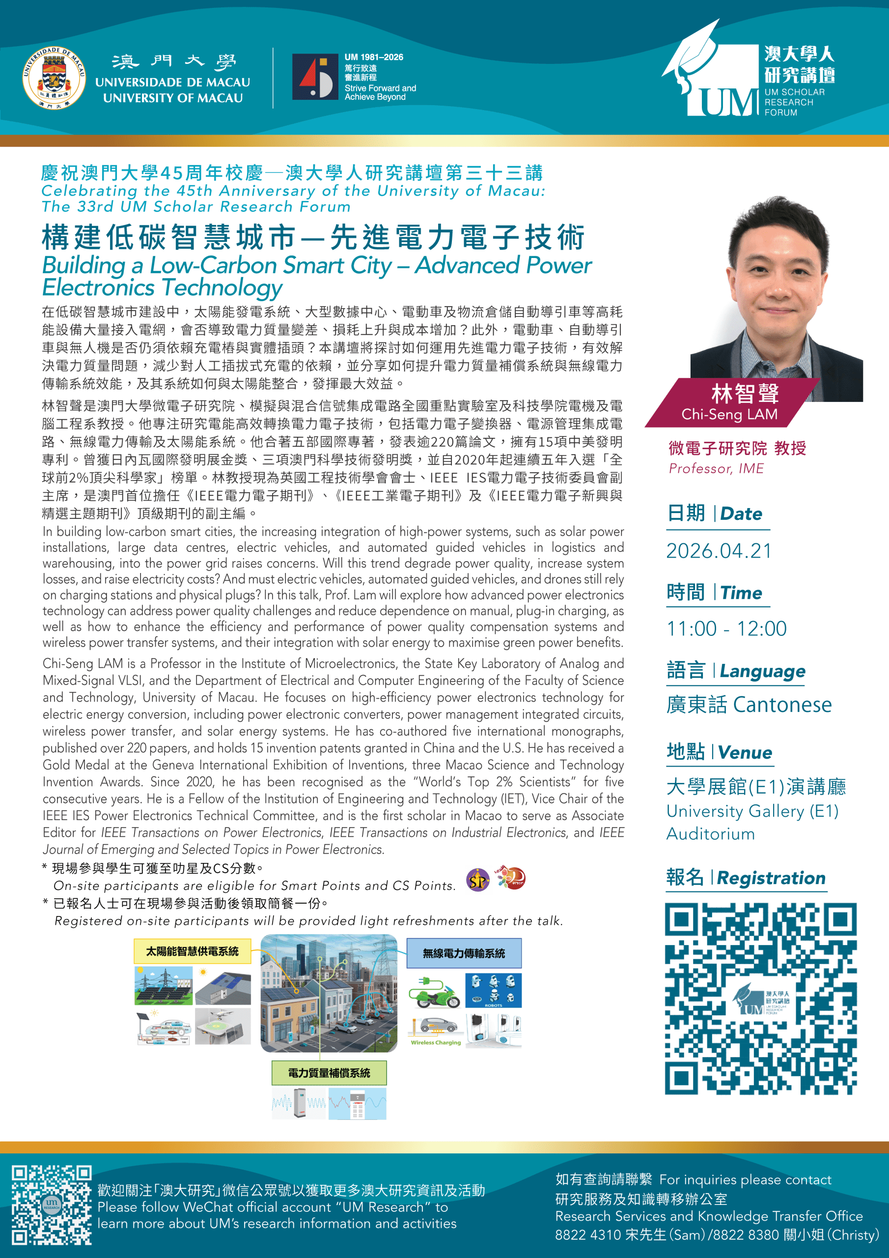 The 33rd UM Scholar Research Forum: “Building a Low-Carbon Smart City – Advanced Power Electronics Technology” [Light Refreshments & 0.5 Smart Point & 10 CS Points]